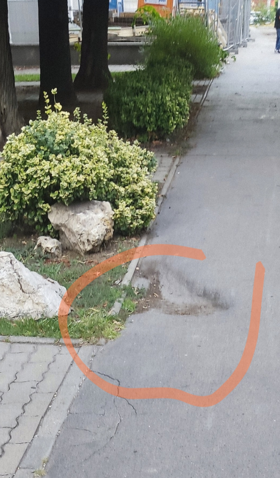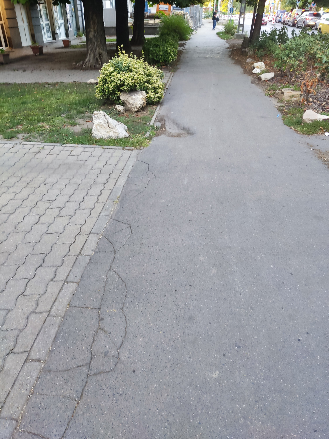 Jelentősen megsüllyedt járda, botlásveszélyes, nehezen észrevehető.