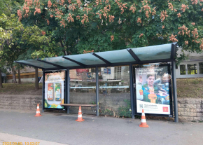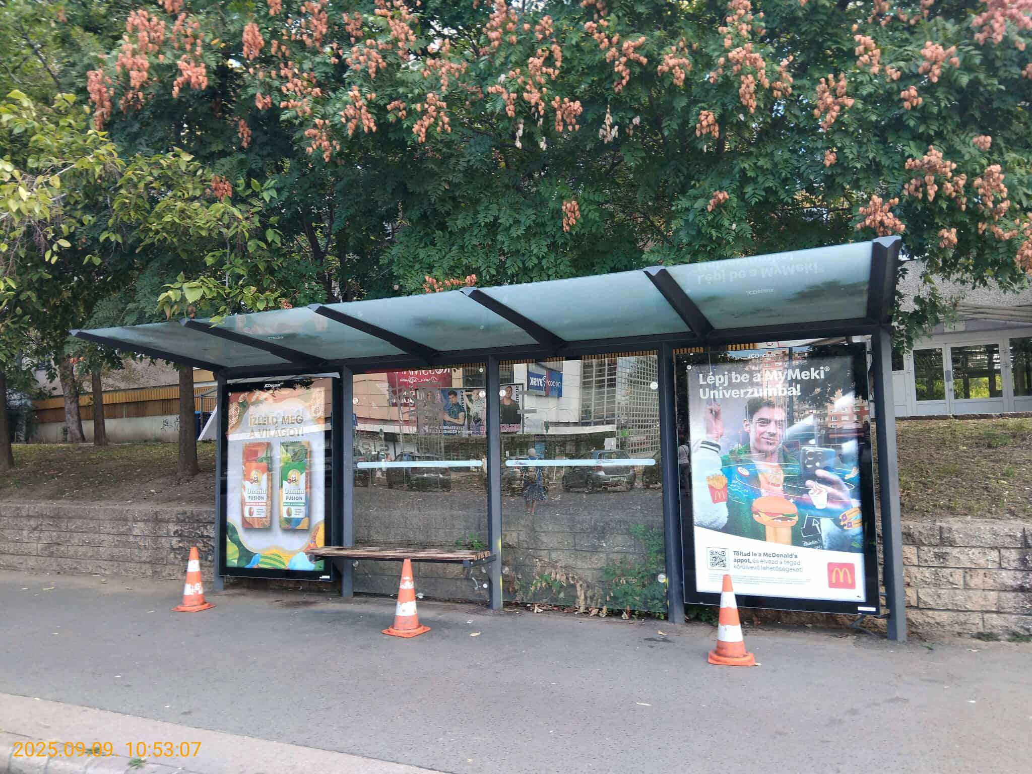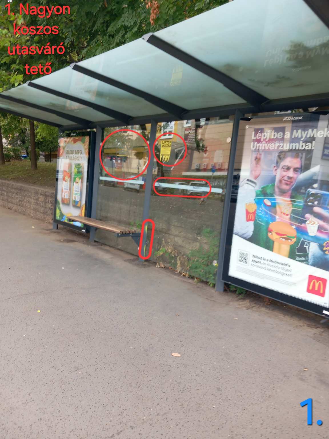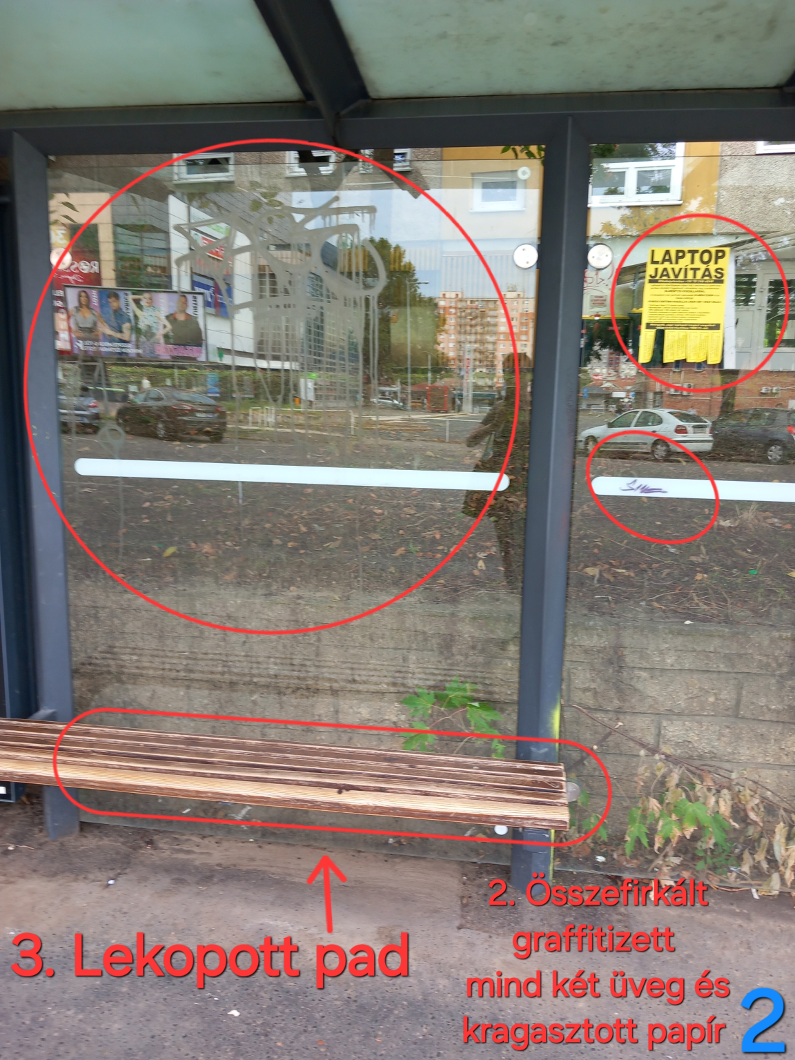 A Simonyi Zsigmond utcai buszmegállónál az utasváró burkolata koszos teteje, illetve az utasvárónak mind két üveg összefirkálva, ki van ragasztva a jobboldali üvegre valamint az utasváró pad lekopás látható ezen az utasvárón