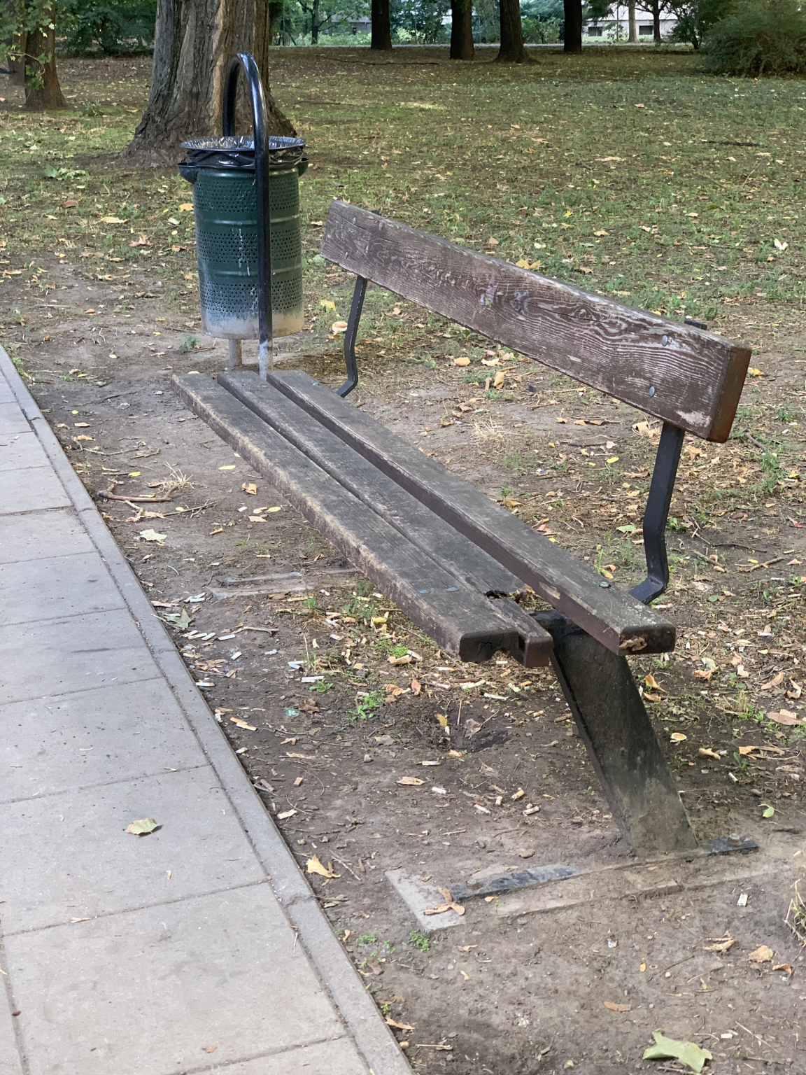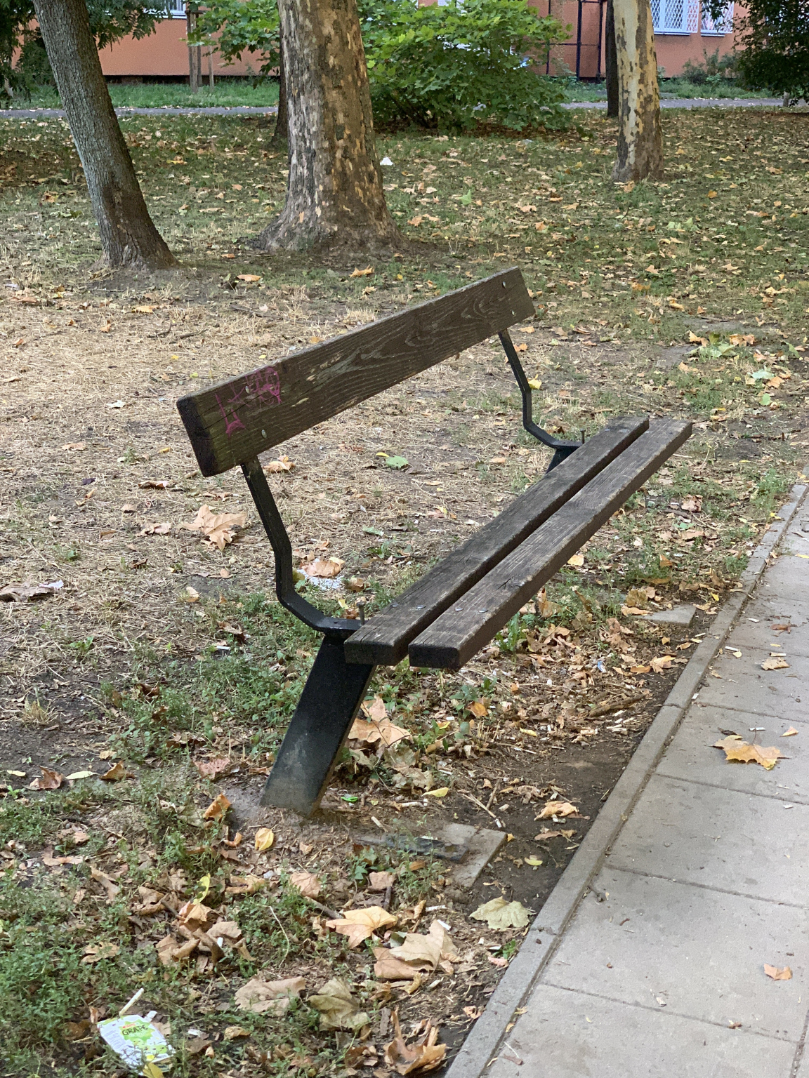 A jelzett helyen a panelházak közti gyalogos sétányon több pad is sérült, rongálódott, jelenleg a kiálló szegek/éles törések miatt balesetveszélyes àllapotú is,