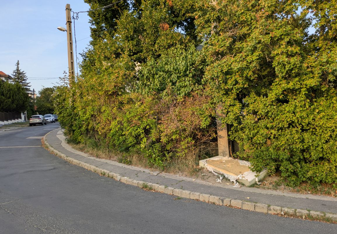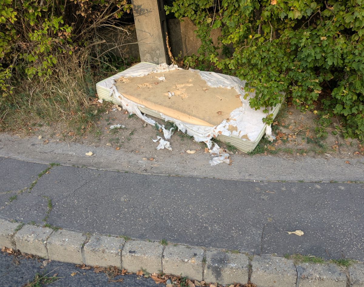 Budapest II. ker. Nagybányai út 67. előtt, a kanyarban az út szélén egy szétszakadt matrac hever.