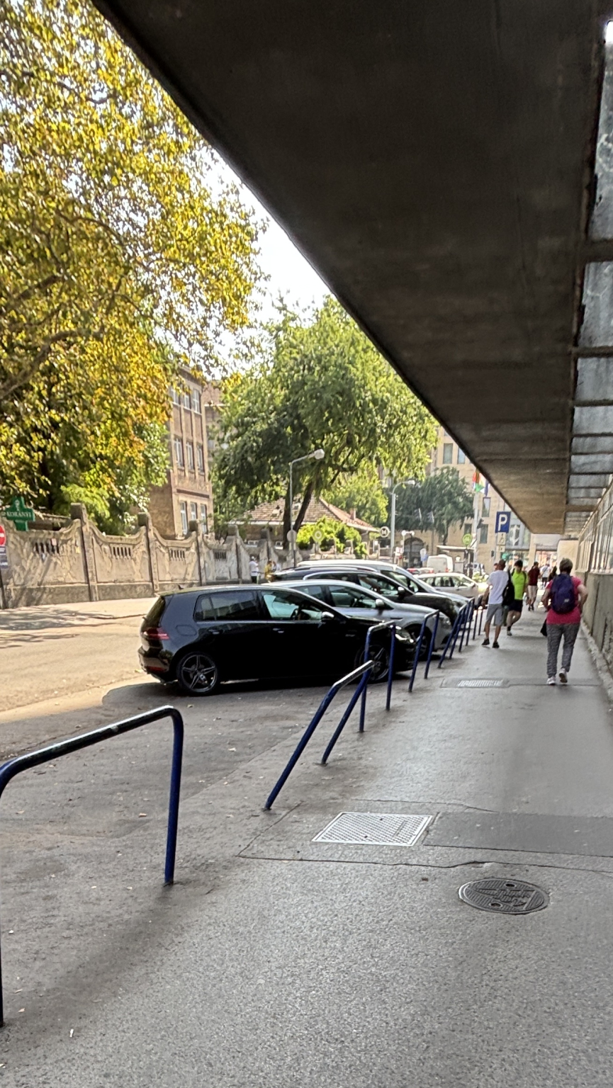A Szigony utcában a kutatóintézet tömbje előtti parkolót a járdától elválasztó korlátok közül egy nagyon ki van dőlve, de több másik is elferdült állapotban van.