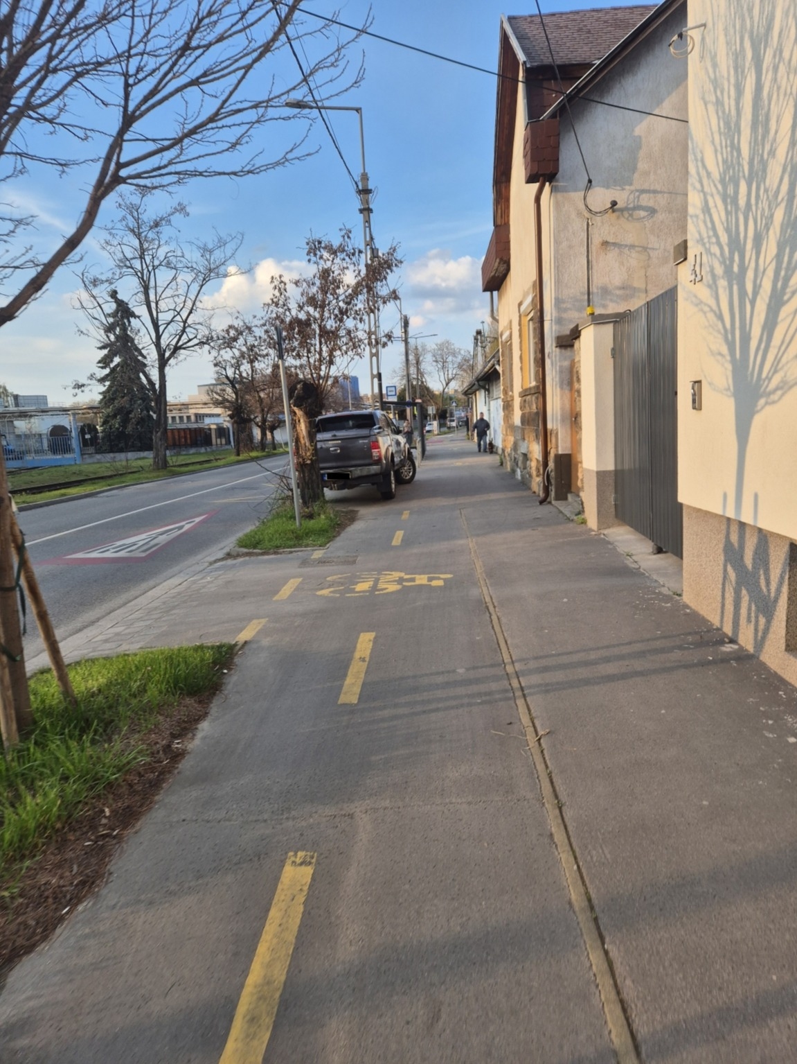 Itt rendszeresen parkolnak így fel a buszmegálloba. Érdemes lenne pár parkolásgátló oszlopot telepíteni oda, legalább a villanyoszlop utáni részre, ahol a kedves pickupos is áll napi rendszerességgel.