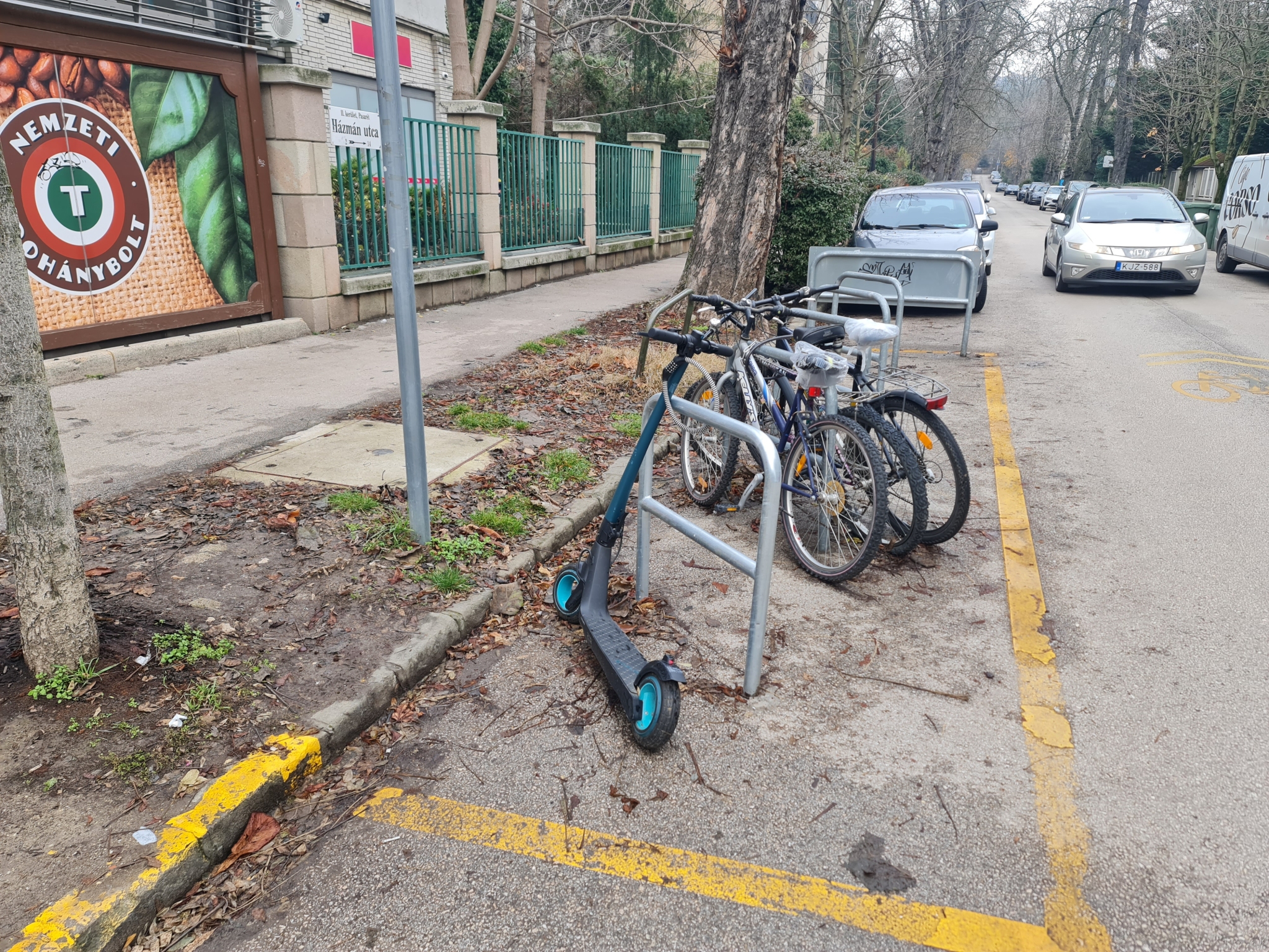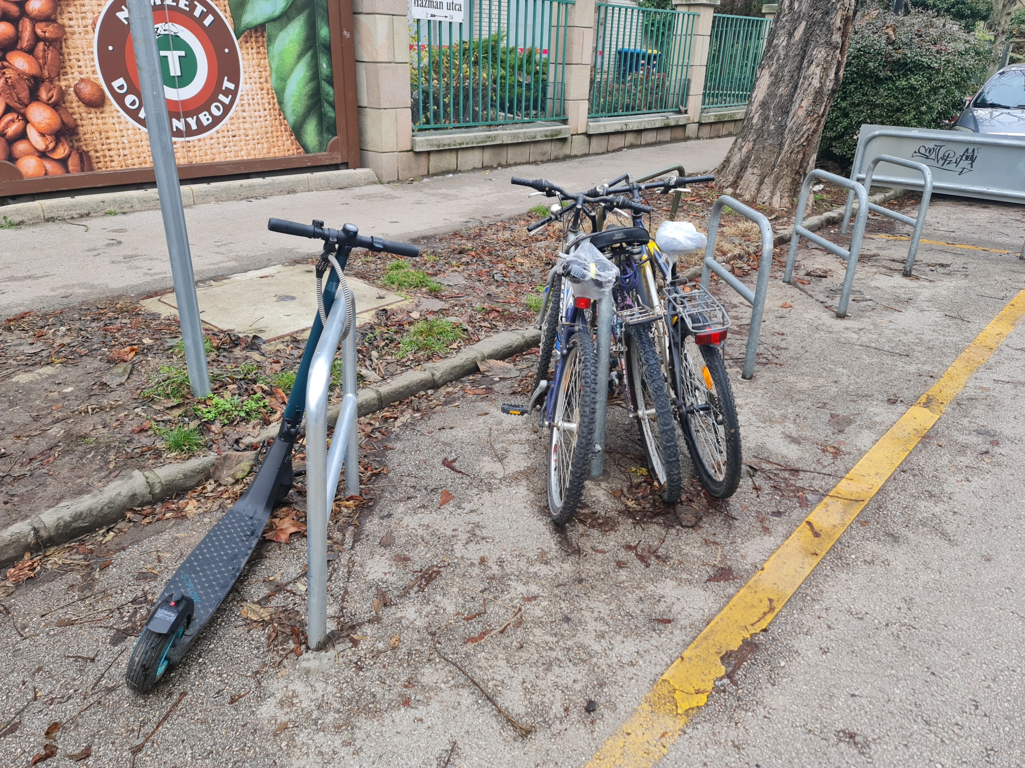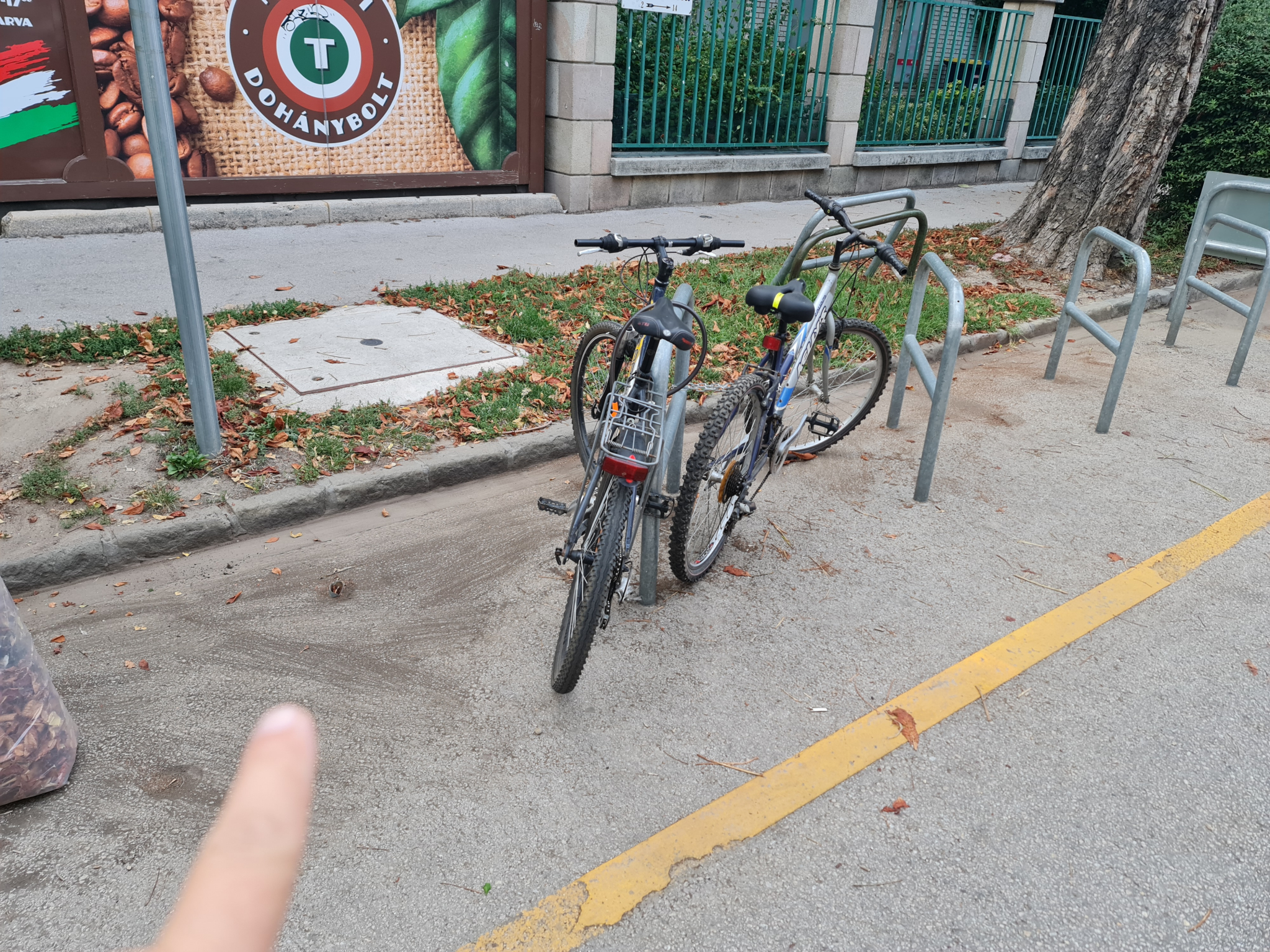 A Házmán utca 2 alatti dohánybolt előtt kidöntöttek egy alumínium kerékpártartó keretet. Odatámasztották a járdán egy hasonló másik kerethez.