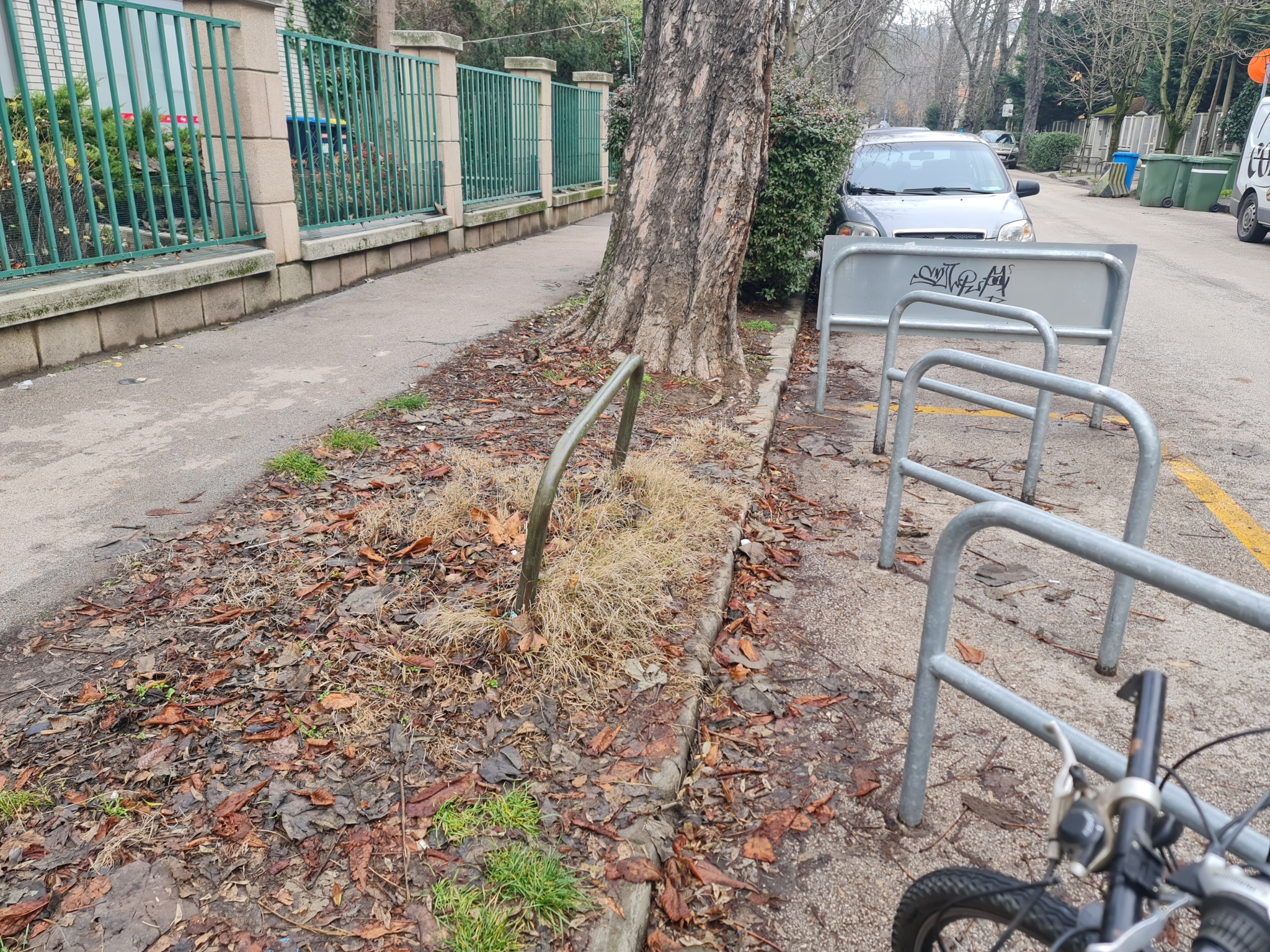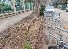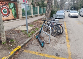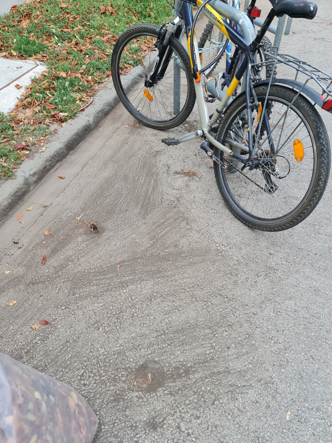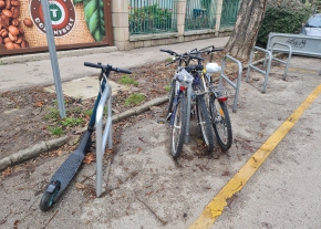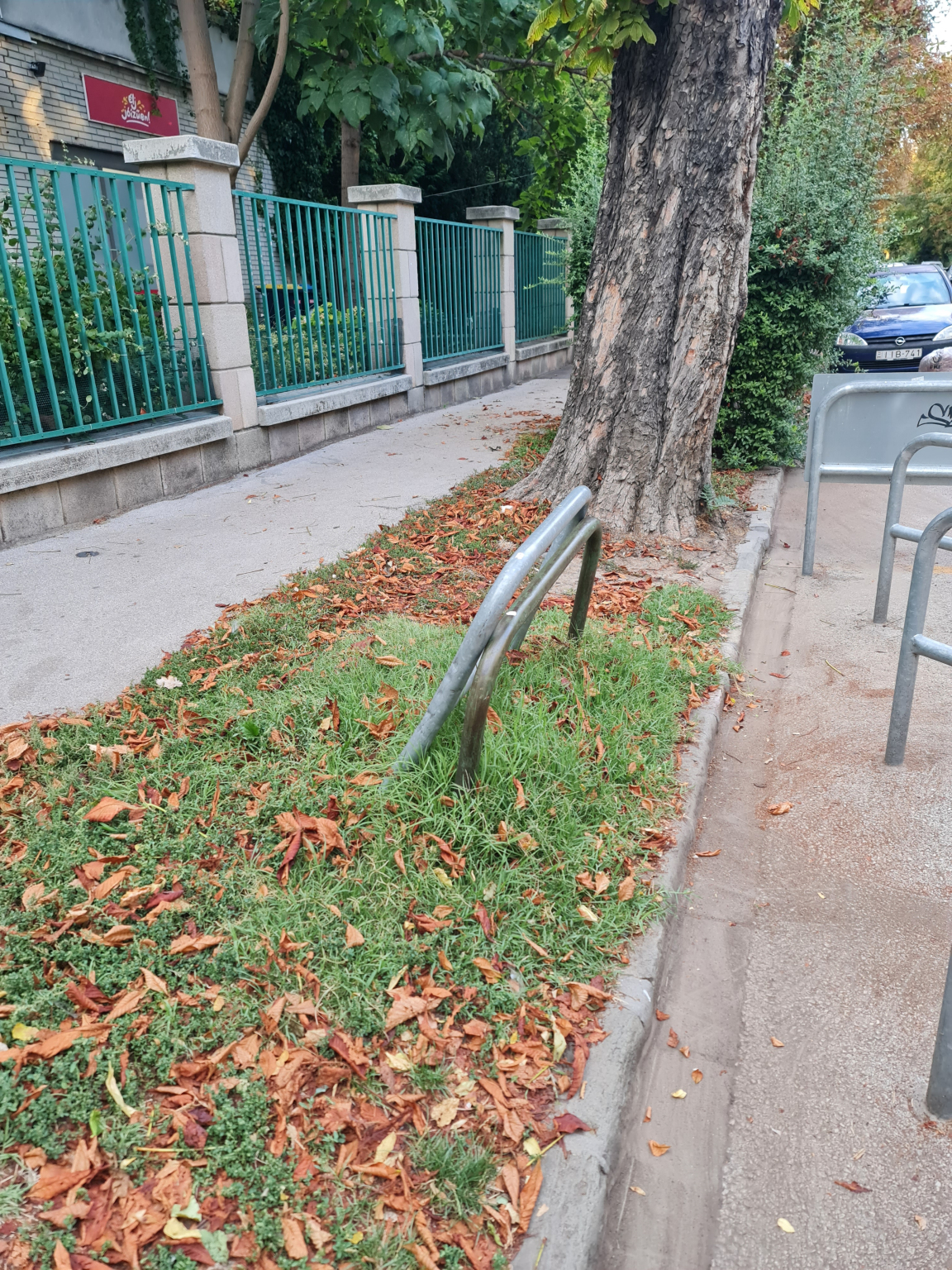 A Házmán utca 2 alatti dohánybolt előtt kidöntöttek egy alumínium kerékpártartó keretet. Odatámasztották a járdán egy hasonló másik kerethez.