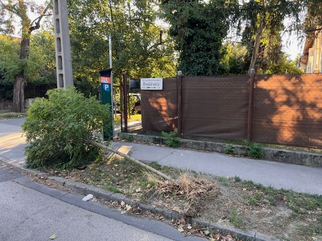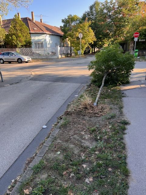 A XIV. kerületi Benkő és Lőcsei utca sarkán egy kisebb fa a járda és az úttest közötti zöldterületre kidőlt. A Benkő utca 15/b. előtt.