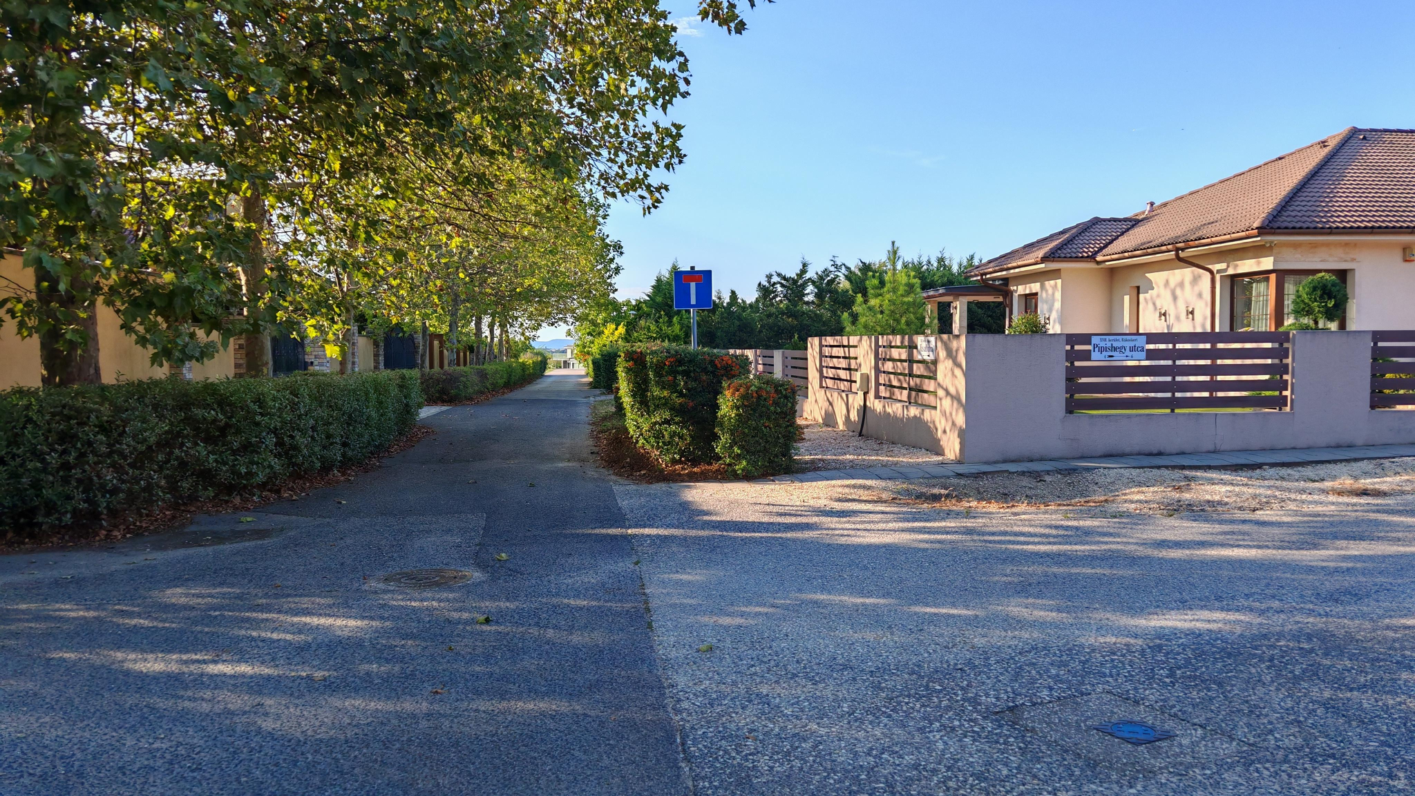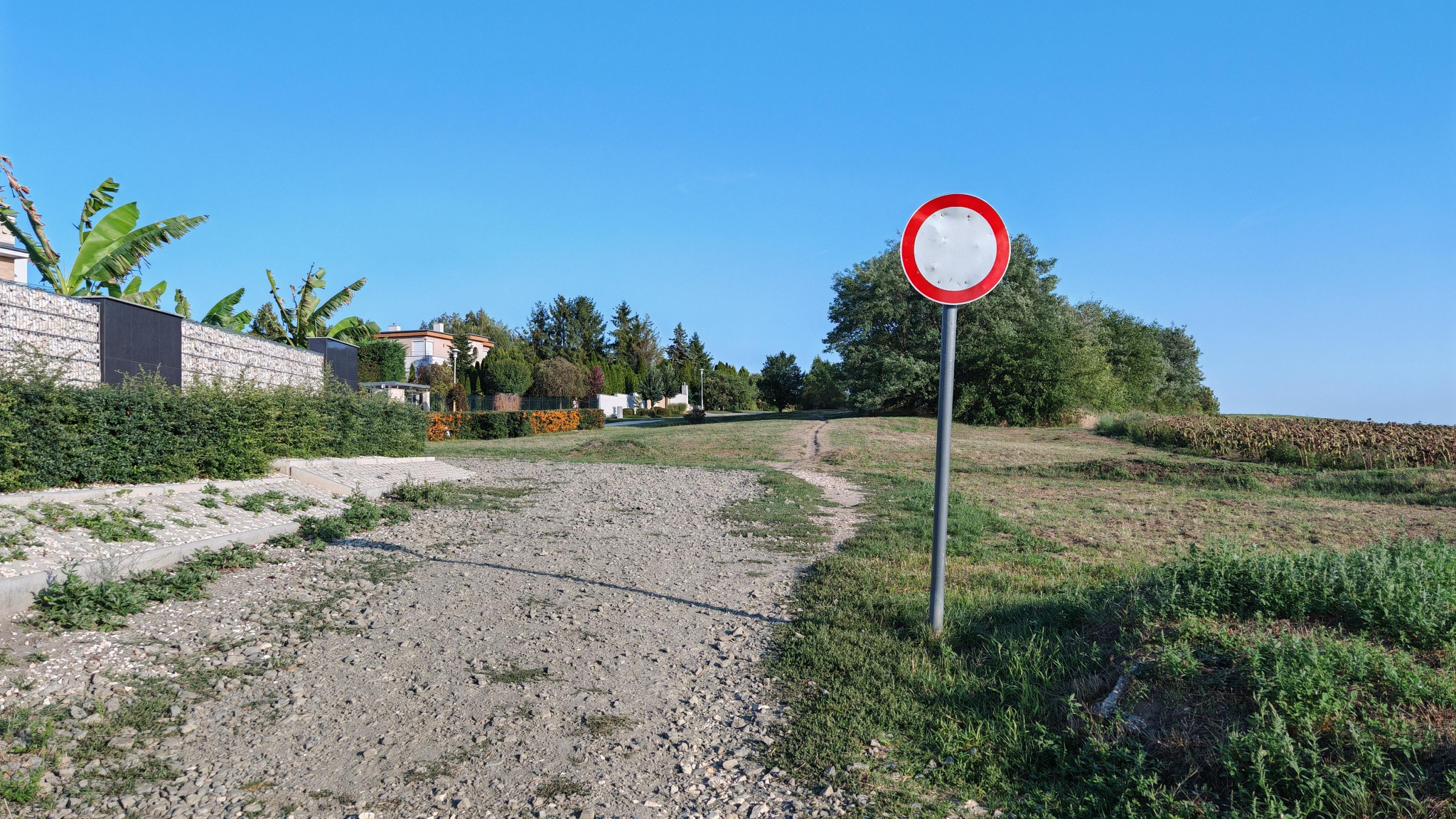 A másik oldalról, a Strázsahegyi dűlő felől viszont egy mindkét irányból behajtani tilos tábla van kint, aminek nincs párja. Amúgy sem megfelelő oda, hiszen az egyetlen ott lakó így is behajt, hisz a tábla mögött van a garázsbejárója. Amúgy is kérdés mennyire érdemes ezekkel a beton elemekkel lezárni az utat. Miért van rá szükség?