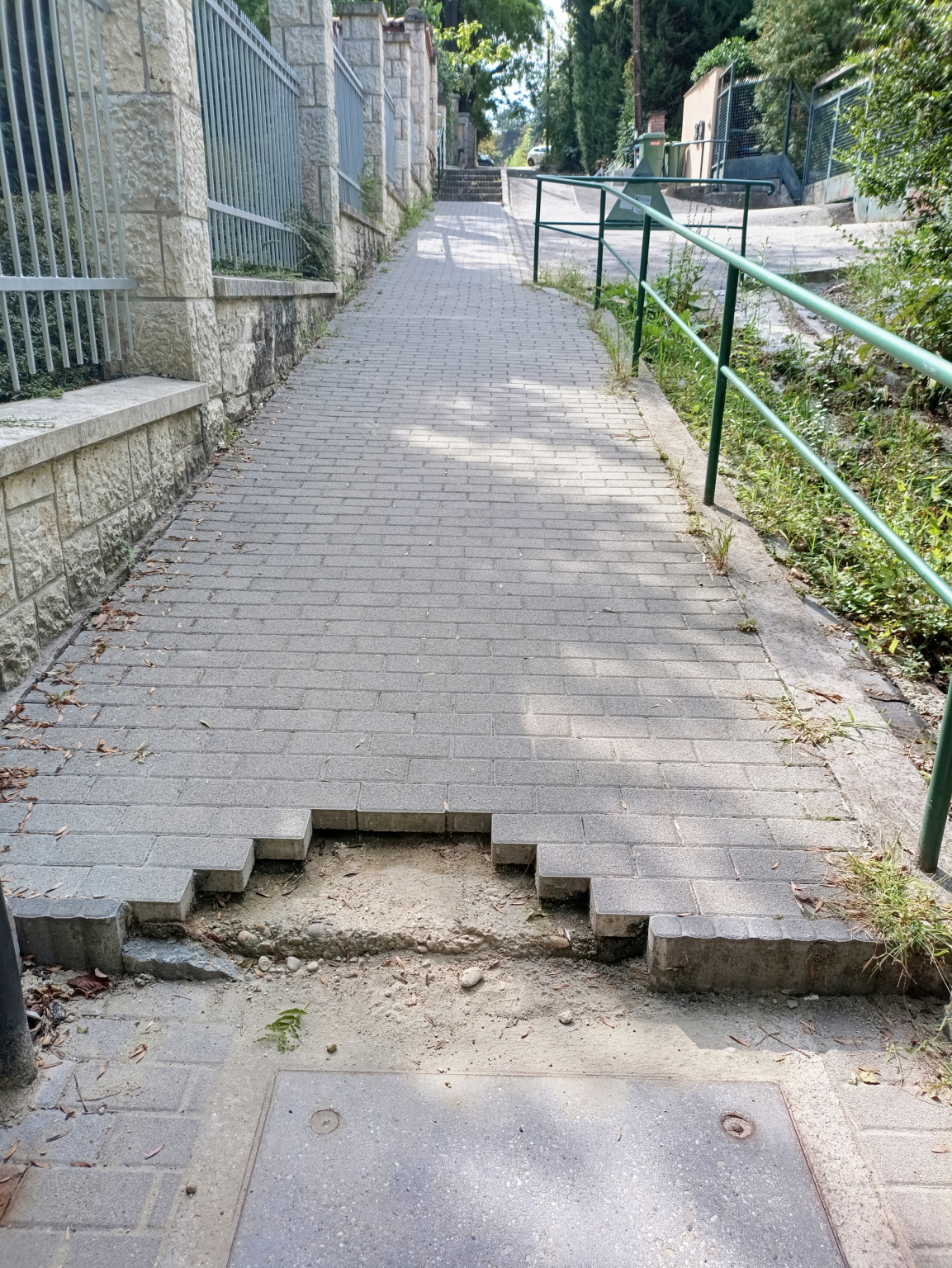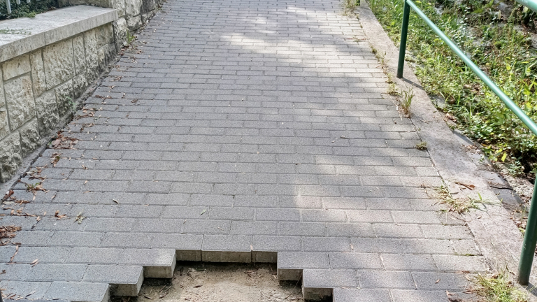 A 12. kerületi Napos út 1/a előtti járda egyik lépcsőjének a peremén elkezdtek kihullani a térkövek.