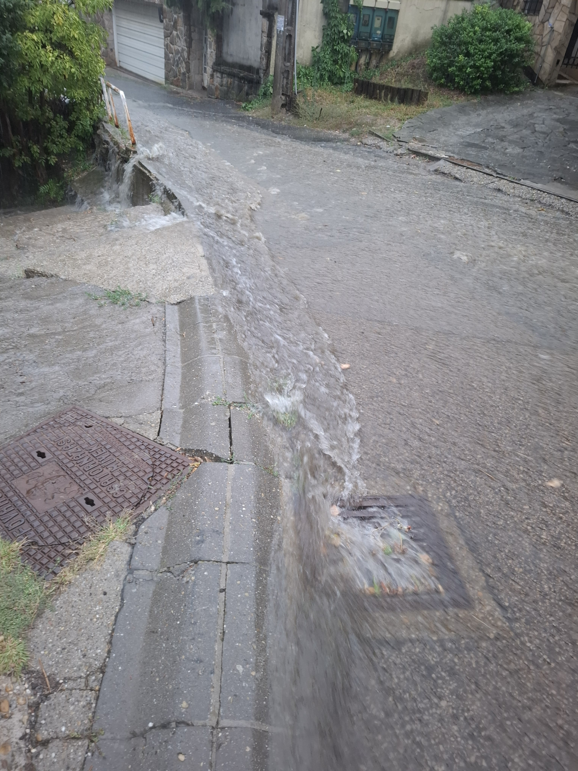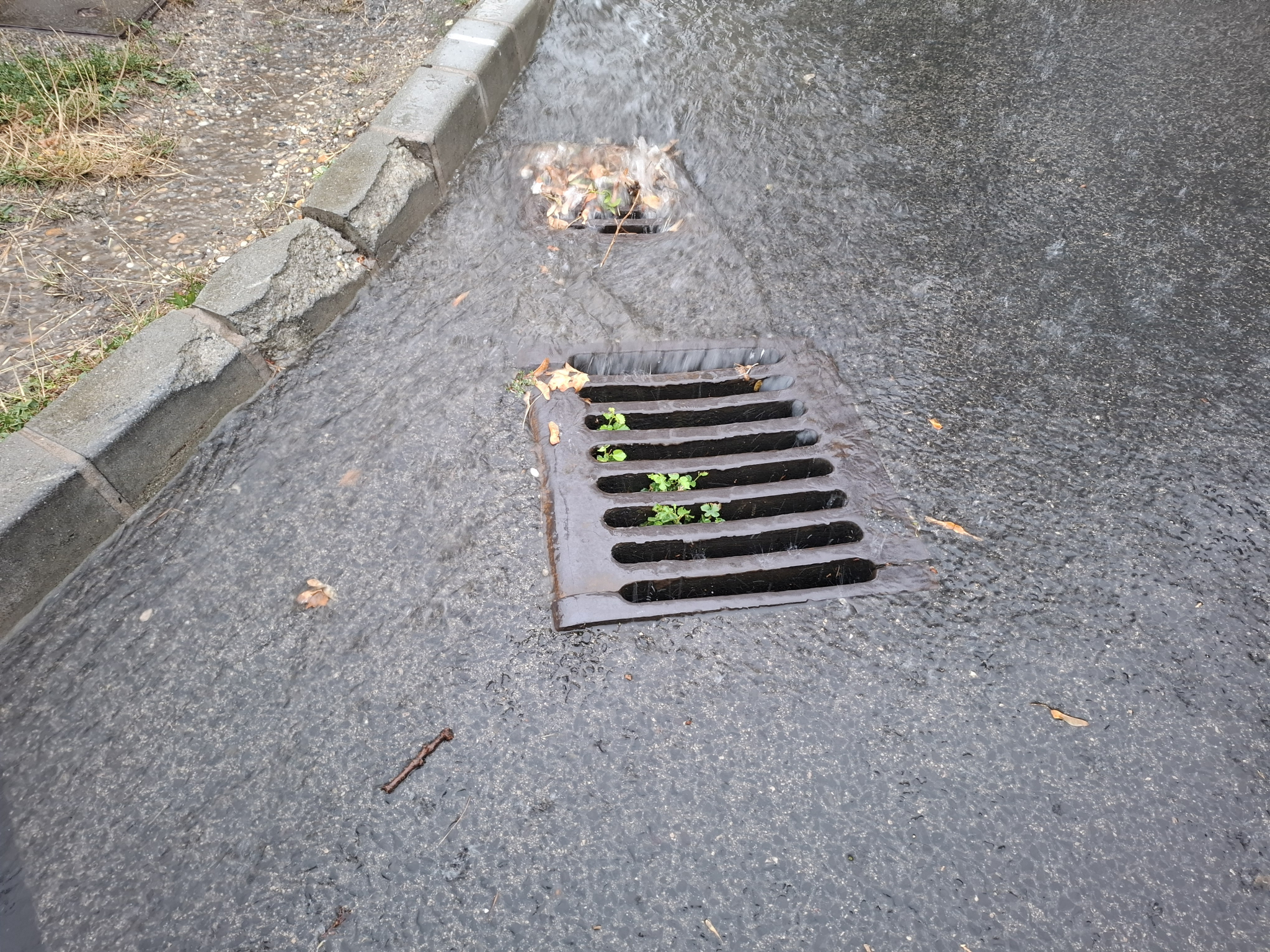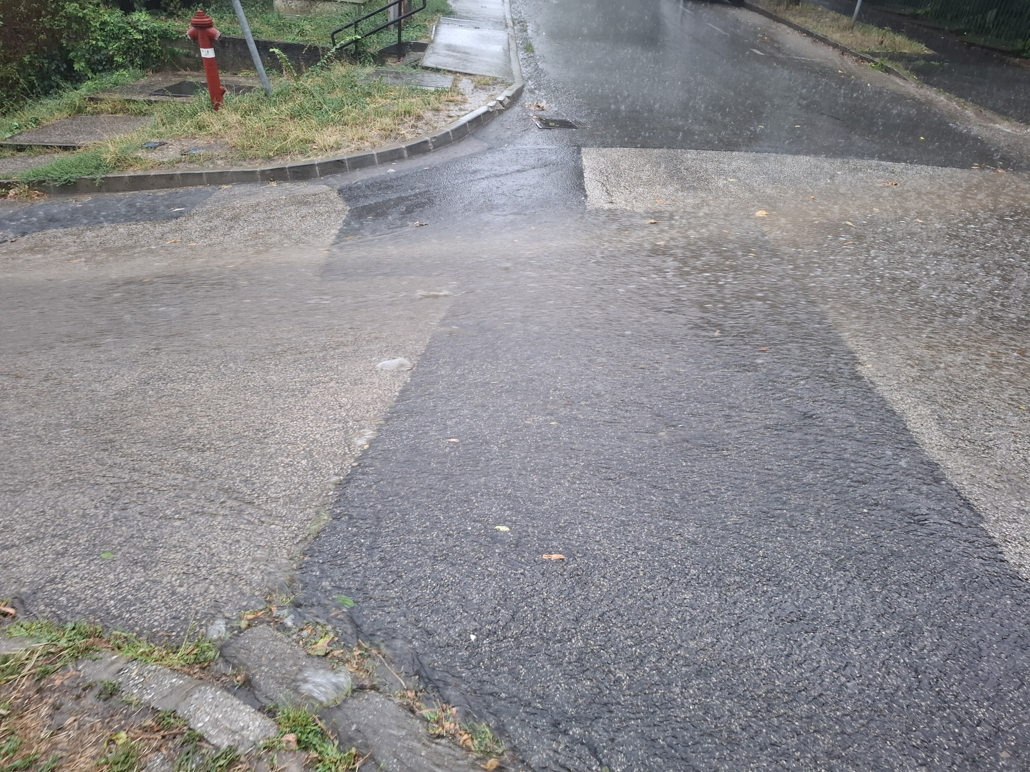 Az alábbi fotókon látható az Apostol út - Szeréna út - Kavics utcai kereszteződésen átfolyó vízmennyiség, és az, hogy a vízfolyás elkerüli a csomópont megépített vízinyelőit.