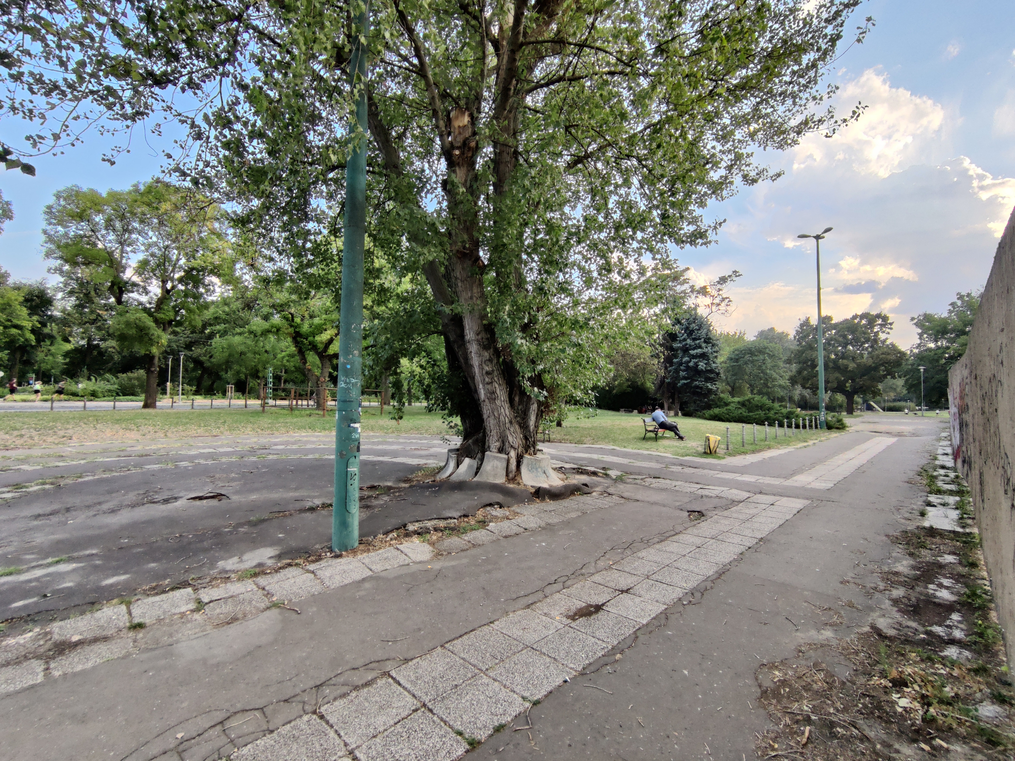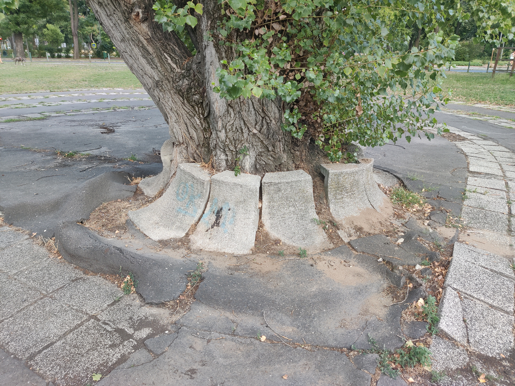 A Városligetben található ez a fa, ami láthatóan már évtizedekkel ezelőtt kinőtte a helyét. Fel kéne szabadítani csórit még ha a környezetét most még nem is rakják rendbe.