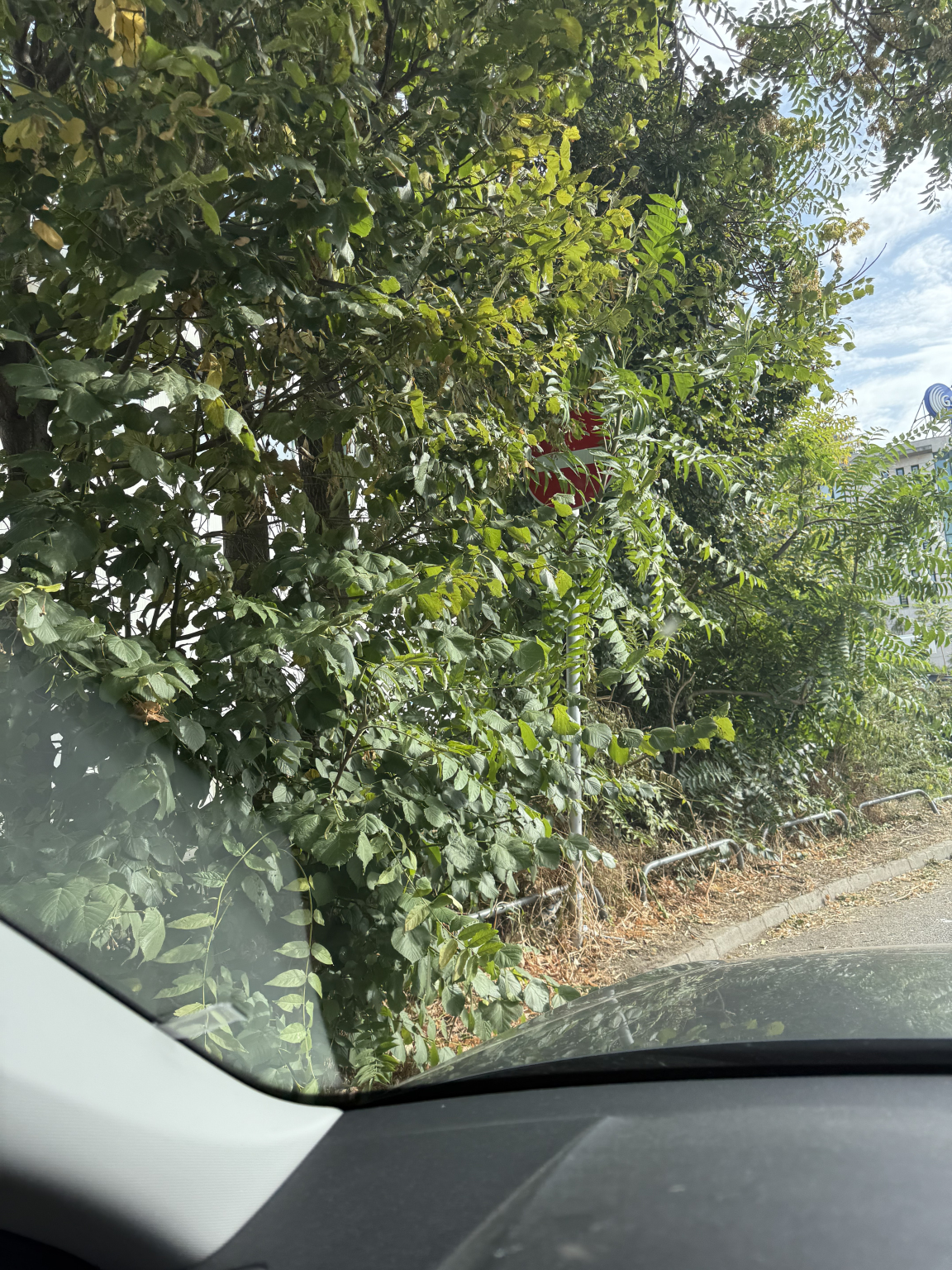 XIII. Vaci ut 96 OMV automoso mogotti/ melletti behajtani tilos tablat, ket hete beforditottak a fak fel, majd atforditottak ellenkezo iranyba. A tabla nehezen lathato, mert benotte a novenyzet, de valakik el is forditottak.
