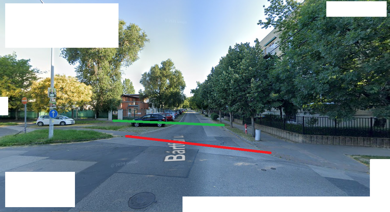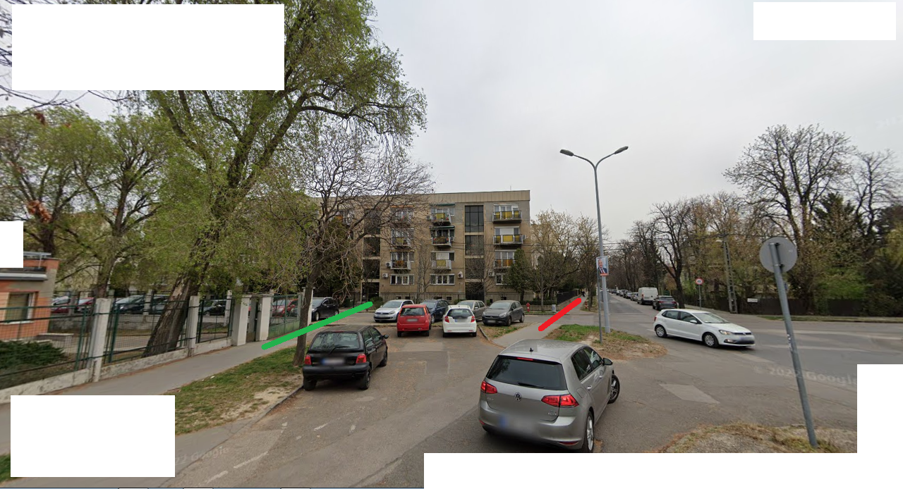Érdemes lenne a képen zölddel rajzolt vonalvezetést létrehozni a gyalogosok számára. - ez amúgy most is működőképes, ha nincsenek ott szorosan parkoló autók, de babakocsit a fűbetonon végigtolni képtelenség. Szóval a babakocsival mész a kijelölt járdán, és reméled hogy rendben át tudsz majd kelni.