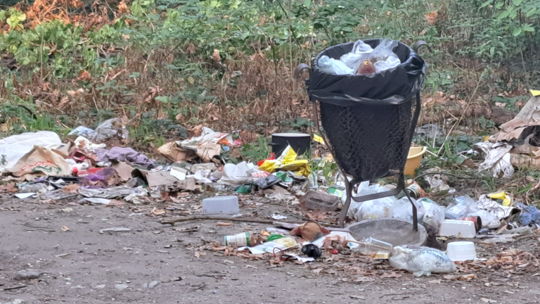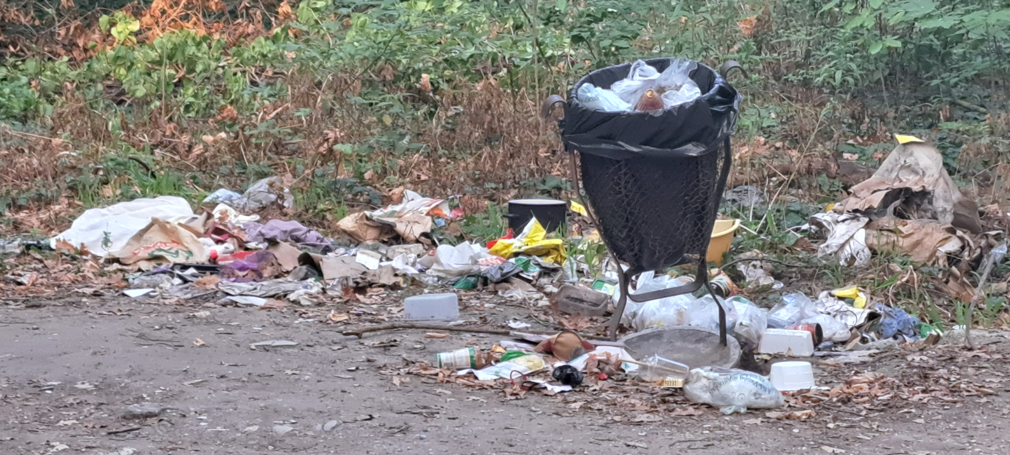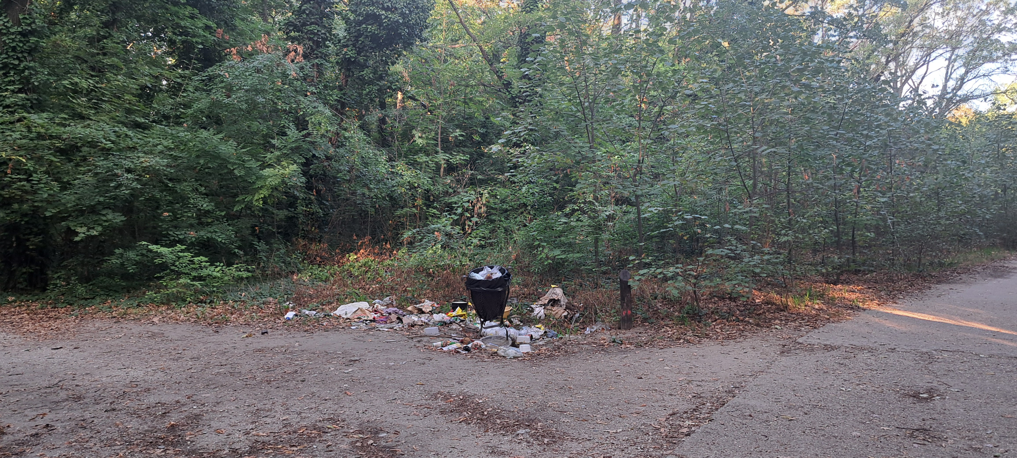 A Határ út melletti kiserdőben két sétálóösvény találkozásánál van egy kis kuka, ami körül már több mint két hete hatalmas széttúrt szemétkupac van. Korábban - talán a Pilisparkerdő két embere - heti rendszerességgel ürítették és rendbe tették a szemetes környékét, de mostanában mintha nem jönnének.
