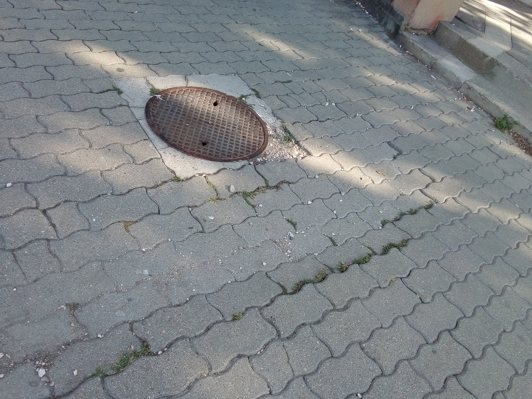 XI. kerület Kelenföld, Karolina u. 72. a térkő burkolat nem egyenletes.