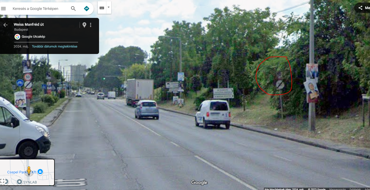 2. Tovább Csepel felé haladva a Szikratávíró utca előtt kb ezen a ponton :47.446334, 19.071767 van egy rosszul látható tábla ami jelzi a 70 végét és 50km/h szakasz kezdetét. Ezt kitakarja egy termetes lámpaoszlop, lásd mellékelt kép. Hiába van kitéve az út mindkét oldalán, ezt ugyanúgy nem tartja be senki. Így az itt következő gyalogátkelő hely és a balra kanyarodási lehetőség a Szabadkikötő SE felé szintén veszélyes pontok.