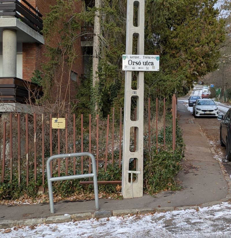 1026 Budapest Orsó utca 51. telek sarkán lévő utca névtábla nehezen olvasható, mert pont a villanyoszlop mögött van. Nemrég cserélték az oszlopot, ami nem pontosan az előző oszlop helyére került, így most a táblát részben takarja. Javaslom az utca névtábla áthelyezését, hogy jobban olvasható legyen.