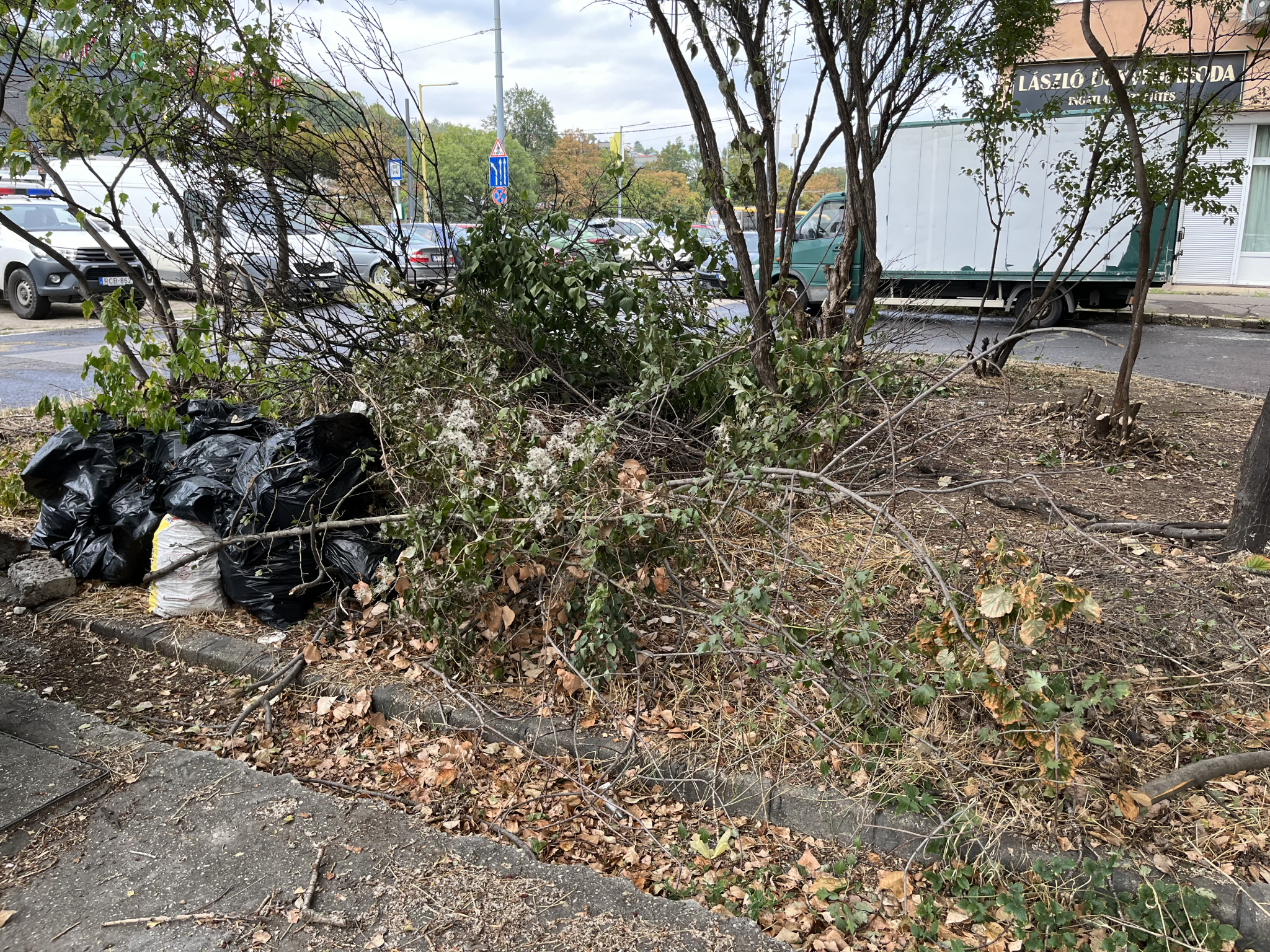 A 3.ker Bécsi út 211 melletti parkolónál több db nagy zacskónyi szemét és lehullott gallyak vannak nagy kupacban.