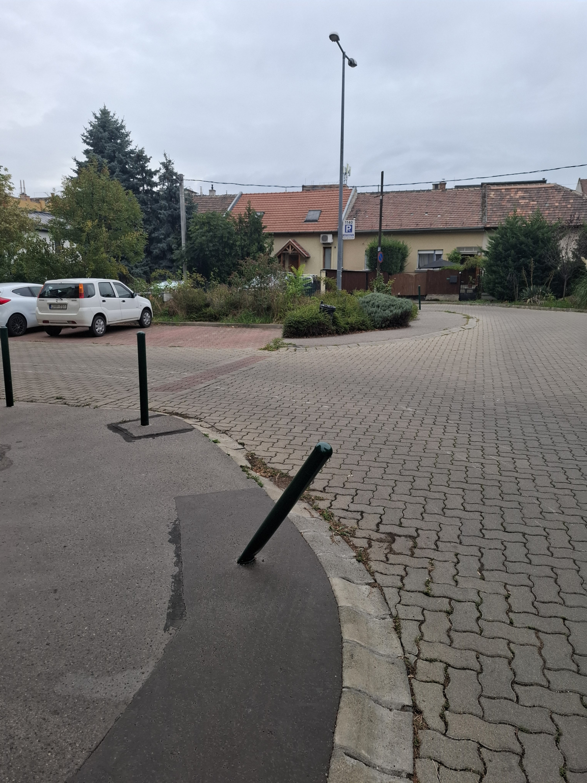 A poller meghajlott, pont az úttest felé. Kicsit be is lóg az úttestre. Kérem javítsák!