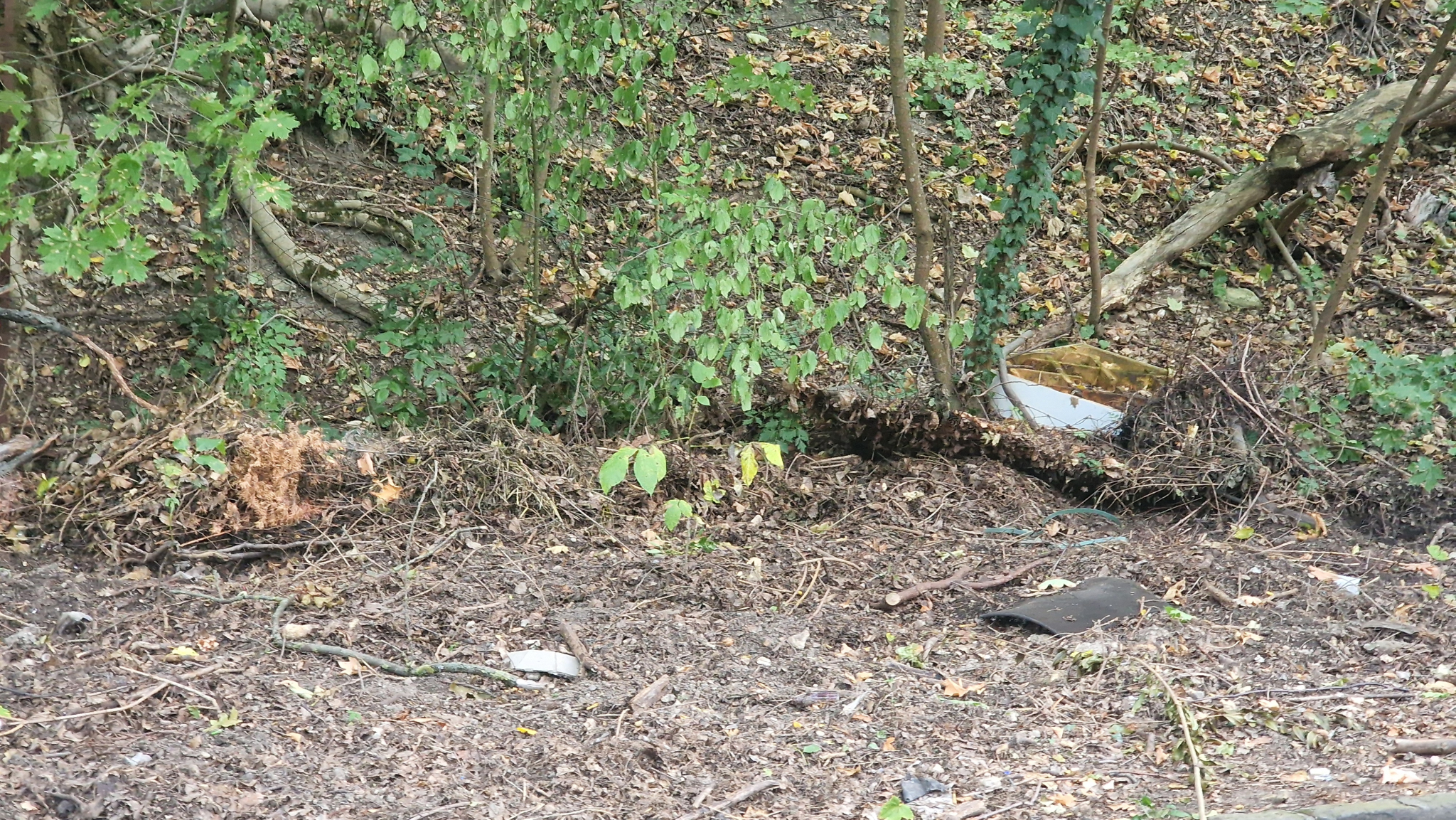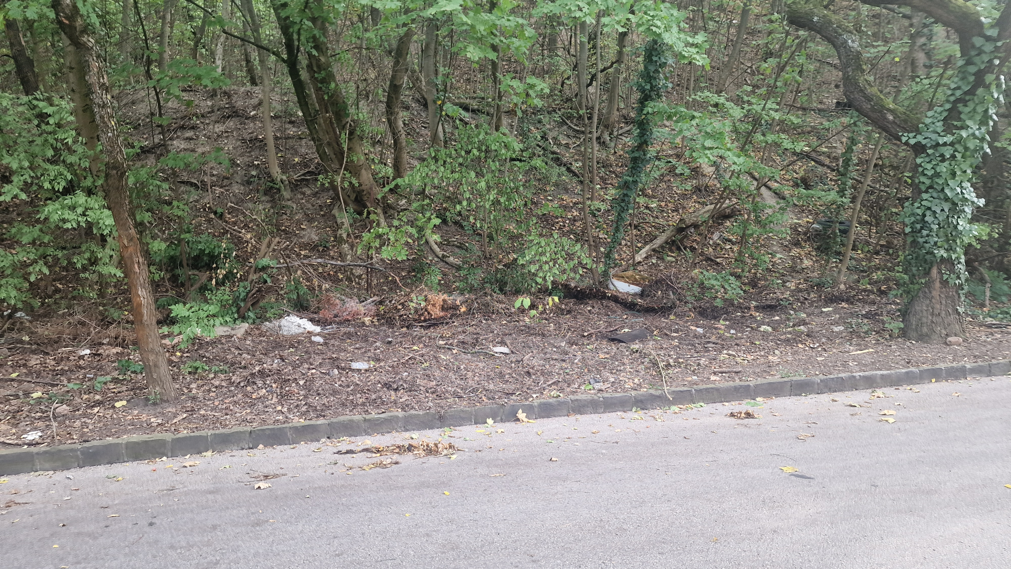 12.kerület Diós árok 17 előtti erdős szakaszban lakossági és építési hulladék .