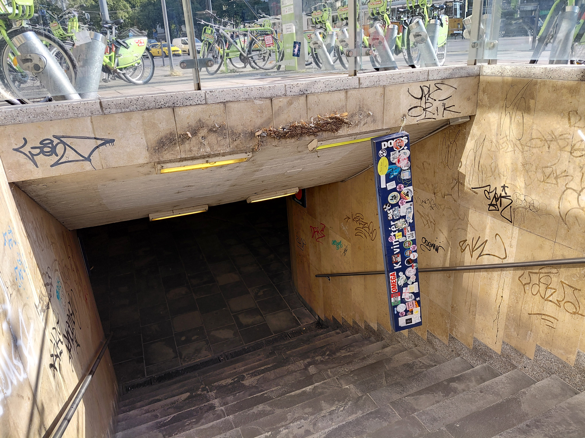 A Kálvin téren, az aluljáró Vámház körúti, 5. kerületi oldalon lévő kijáratánál (Kálvin tér 1. előtt) a lépcső felett leesett a tájékoztató tábla és jelenleg egy drót tartja, balesetveszélyesen lóg.