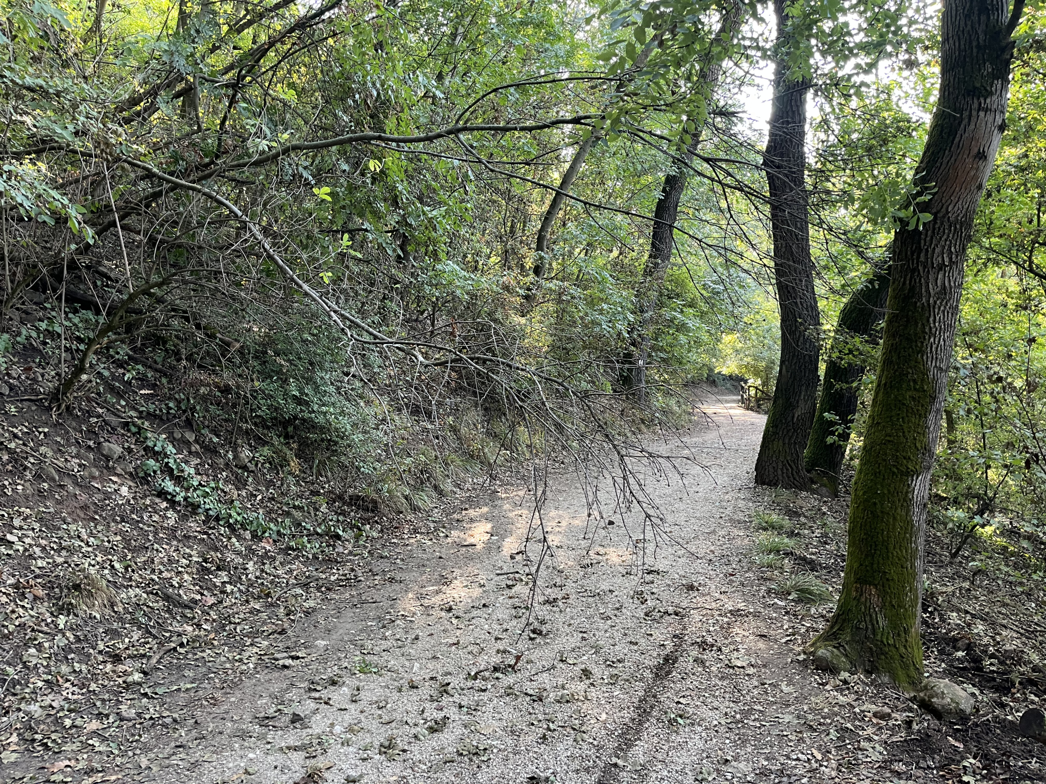 Lejtő után, enyhe kanyarban van az turista útra dőlt fa, ráadásul már falevelek is vannak rajta, ezért elég veszélyes a bringásokra (is). Kérem a Pilisi Parkerdőt vágja le a fát. Köszi