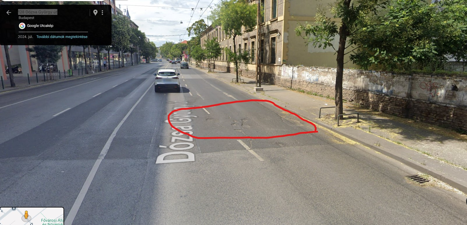 A jelzett helyen a kétsávos úton a jobb sávban súlyos aszfalthiány van. Több négyzetméteren hiányzik az útfelület felső rétege, így az erre közlekedőknek erősen fékezniük kell és kerülgetniük kell az úthibákat. Ez sokszor okoz balesetveszélyes helyzetet. Kérjük az út javítását! Köszönjük!