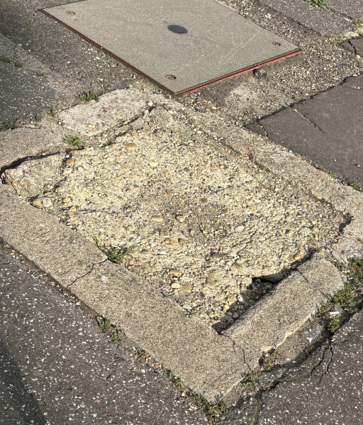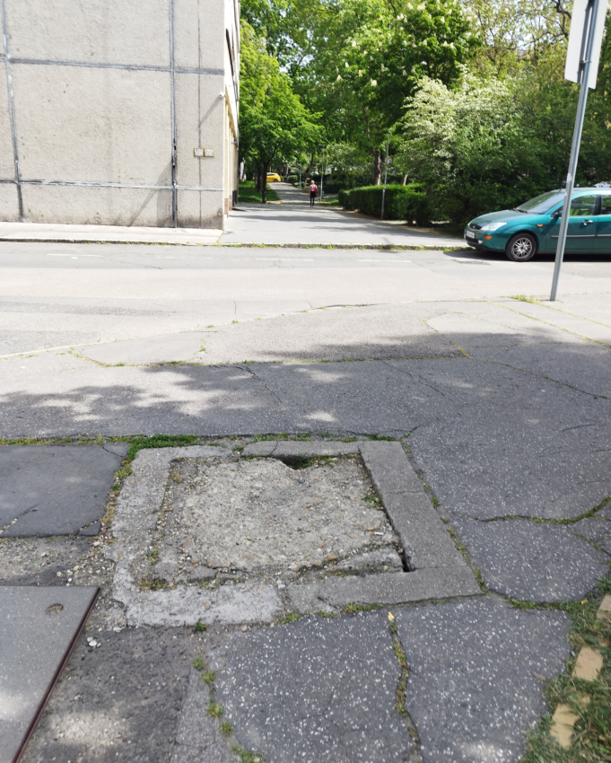 Google alapján már 14+ éve sérült. Nem sikerült rájönni mi volt ott, vagy mi van alatta, de évről-évre egyre jobban megsüllyed és beszakadhat.