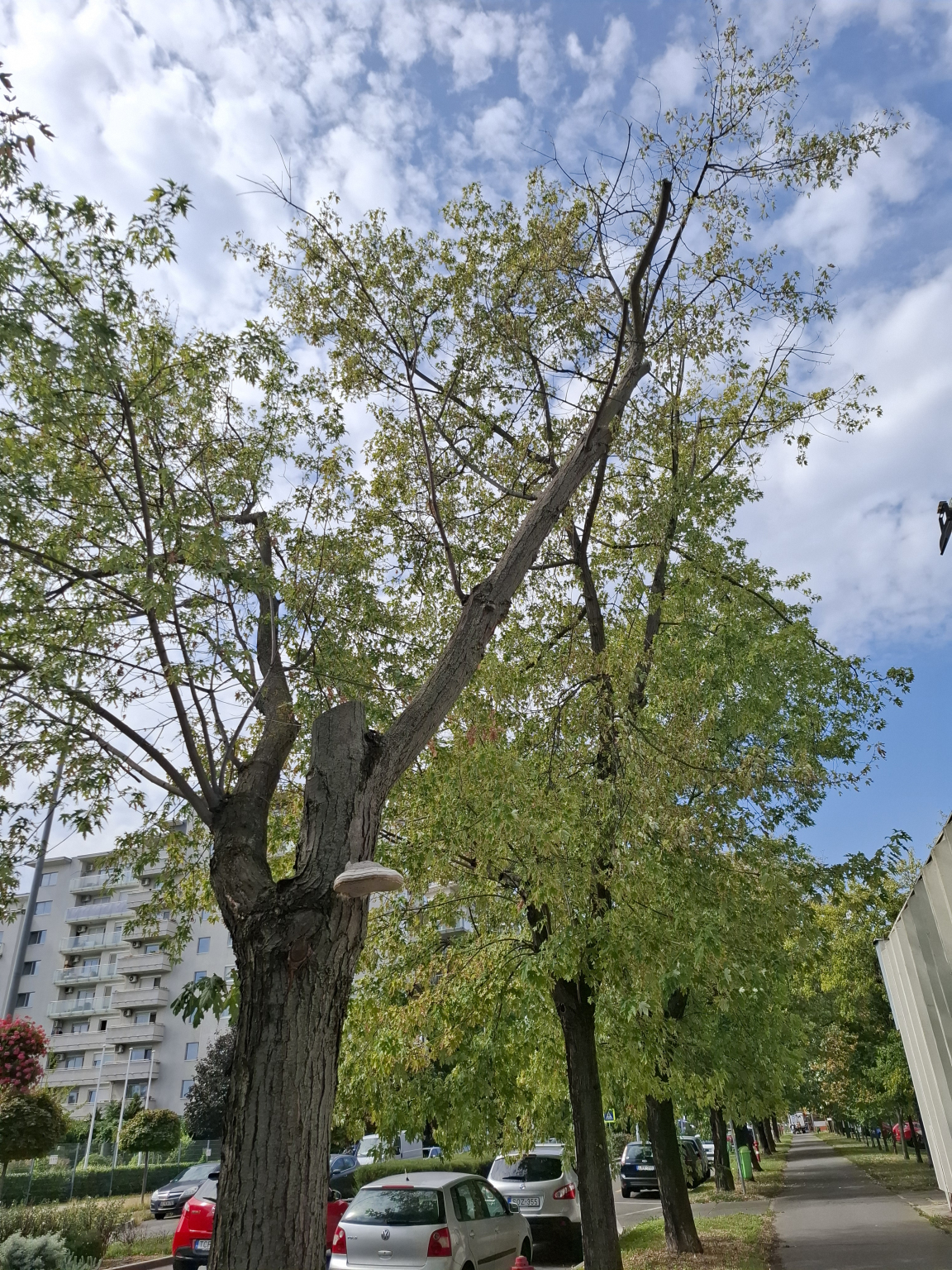 A fán nagy taplógombák vannak és a járda felőli része elszáradt a fának.