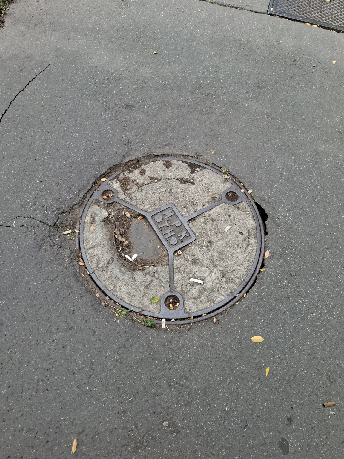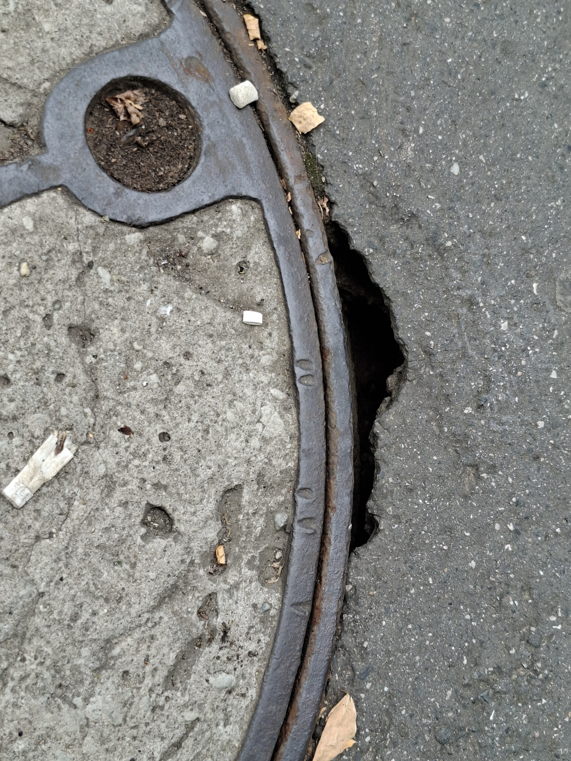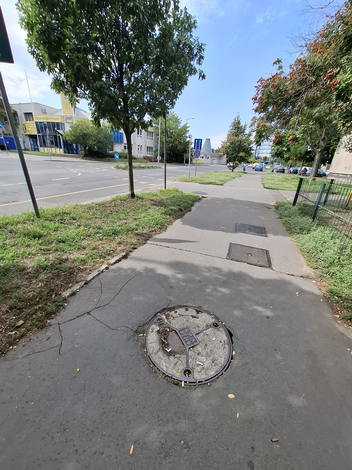 Az aknafedél a járda közepén beszakadt, megsüllyedt, lyuk keletkezett a szélén. Kérem mielőbb javítsák!