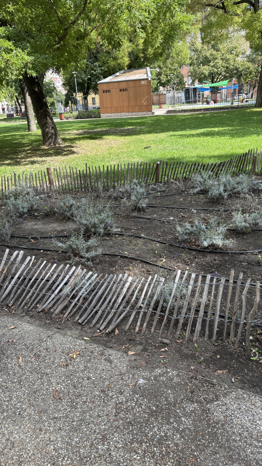 A Kálvária tér parkos részének közepén az egyik ágyás kiskerítése megrongálódott