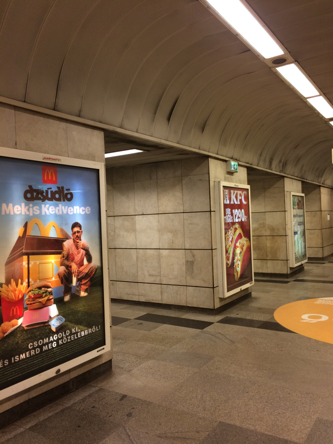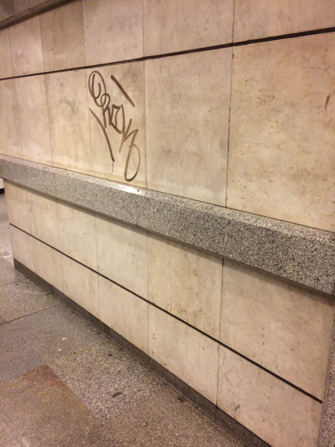 Az M2-es metró Astoria megállójában elképesztően koszos a mennyezet, a megálló falazata több helyen firkás, rongált, graffitis.