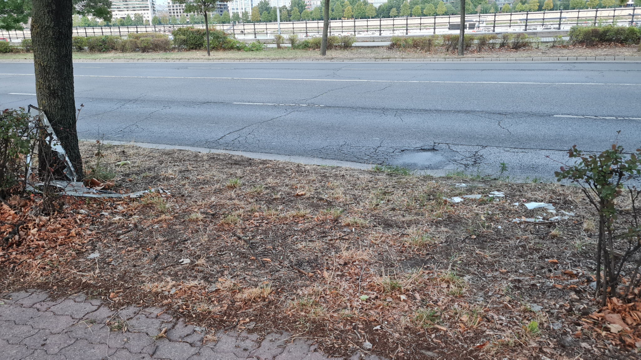 Egy nagy darab törött üveghulladék található az út szélén, ami balesetveszélyes.