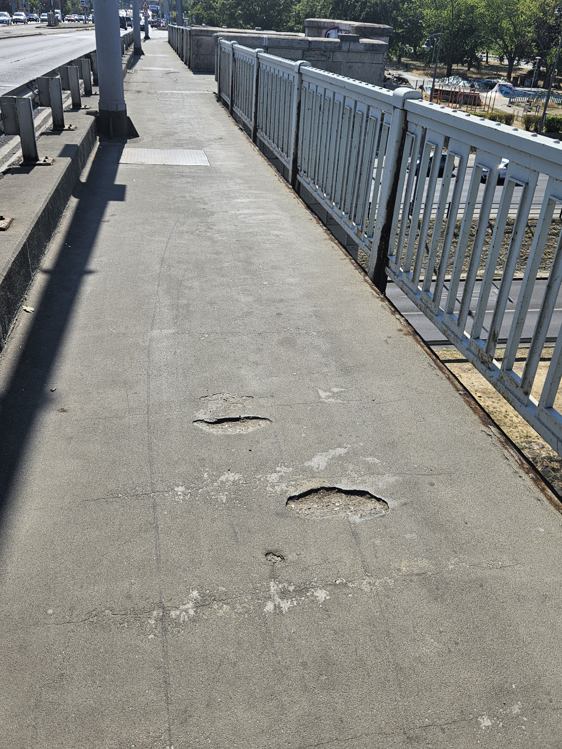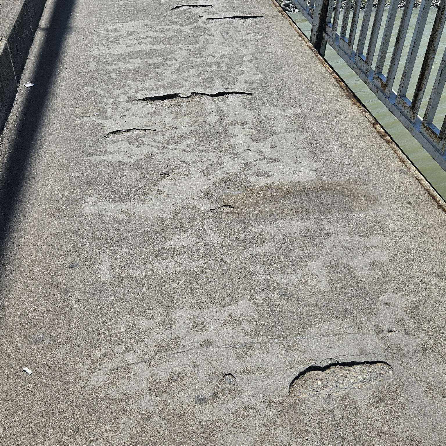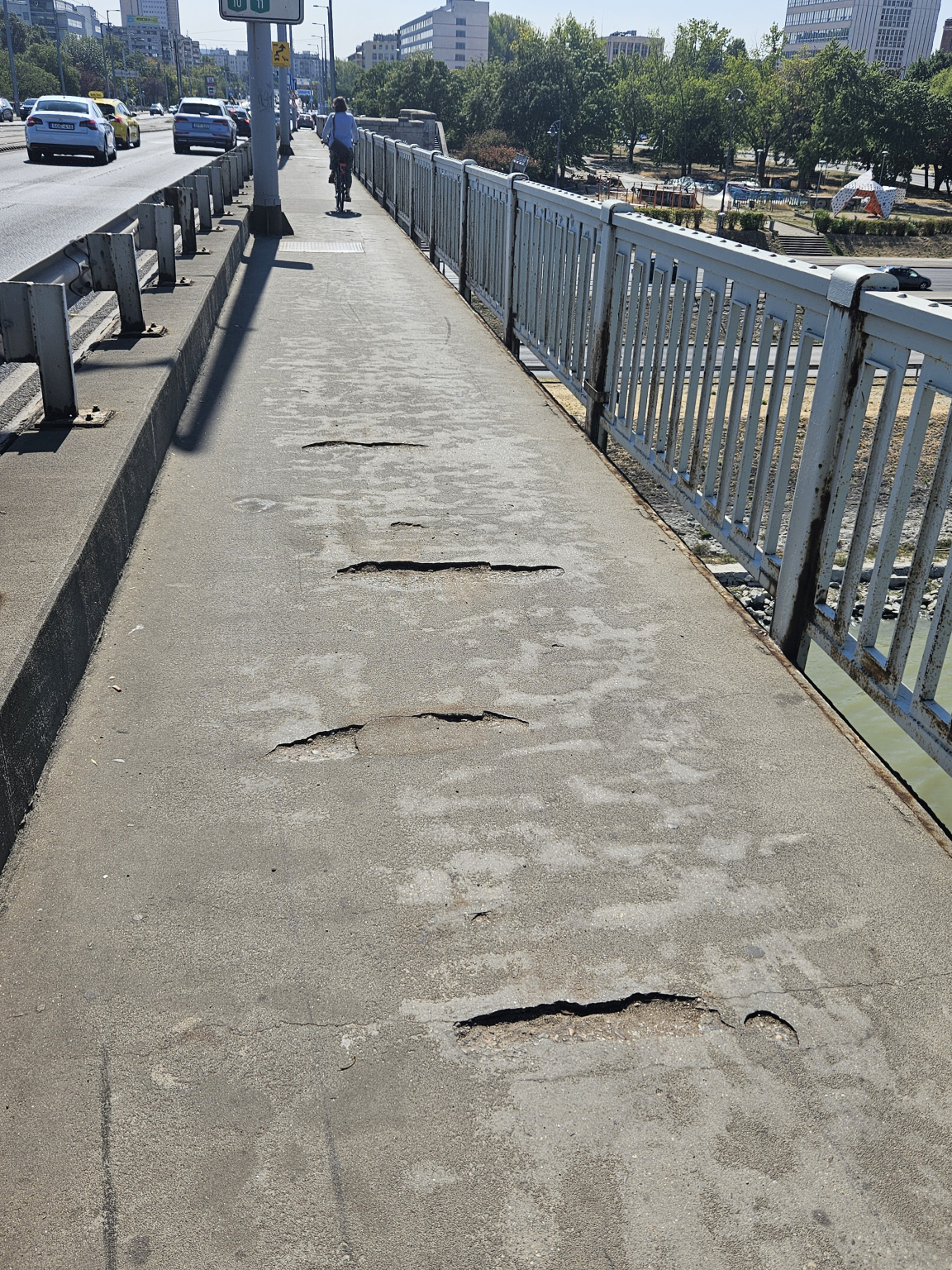 Sok kátyúk van a Petőfi híd északi járdáján.