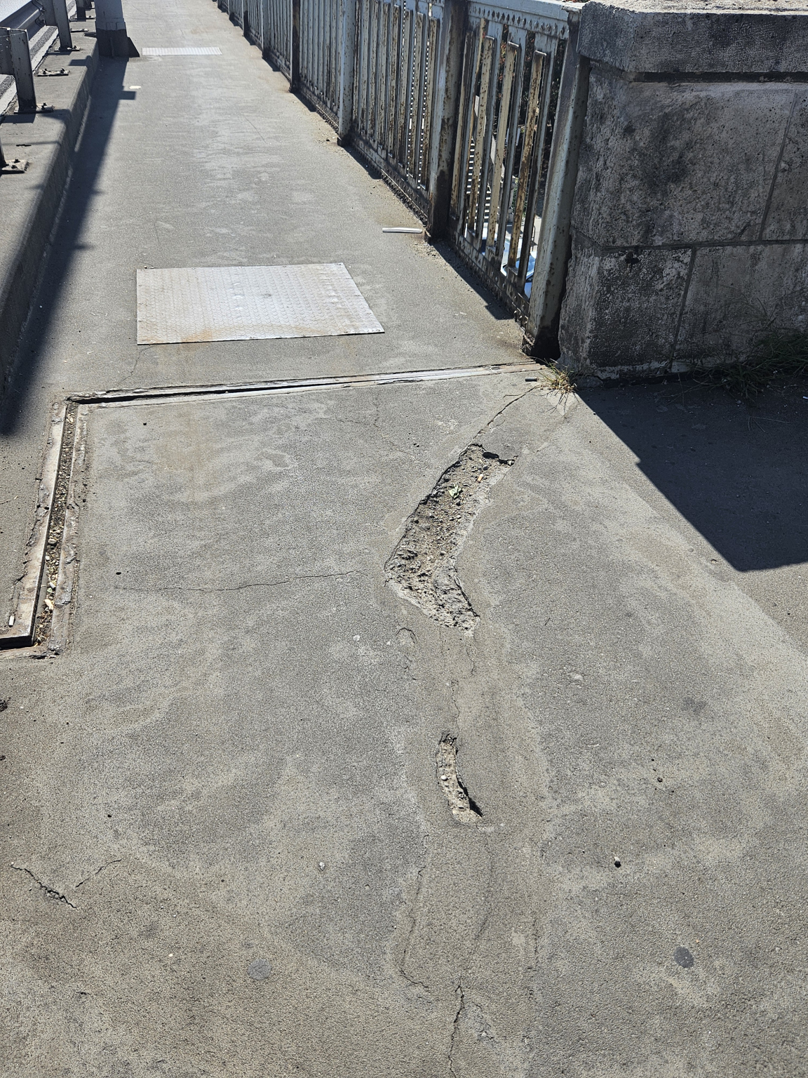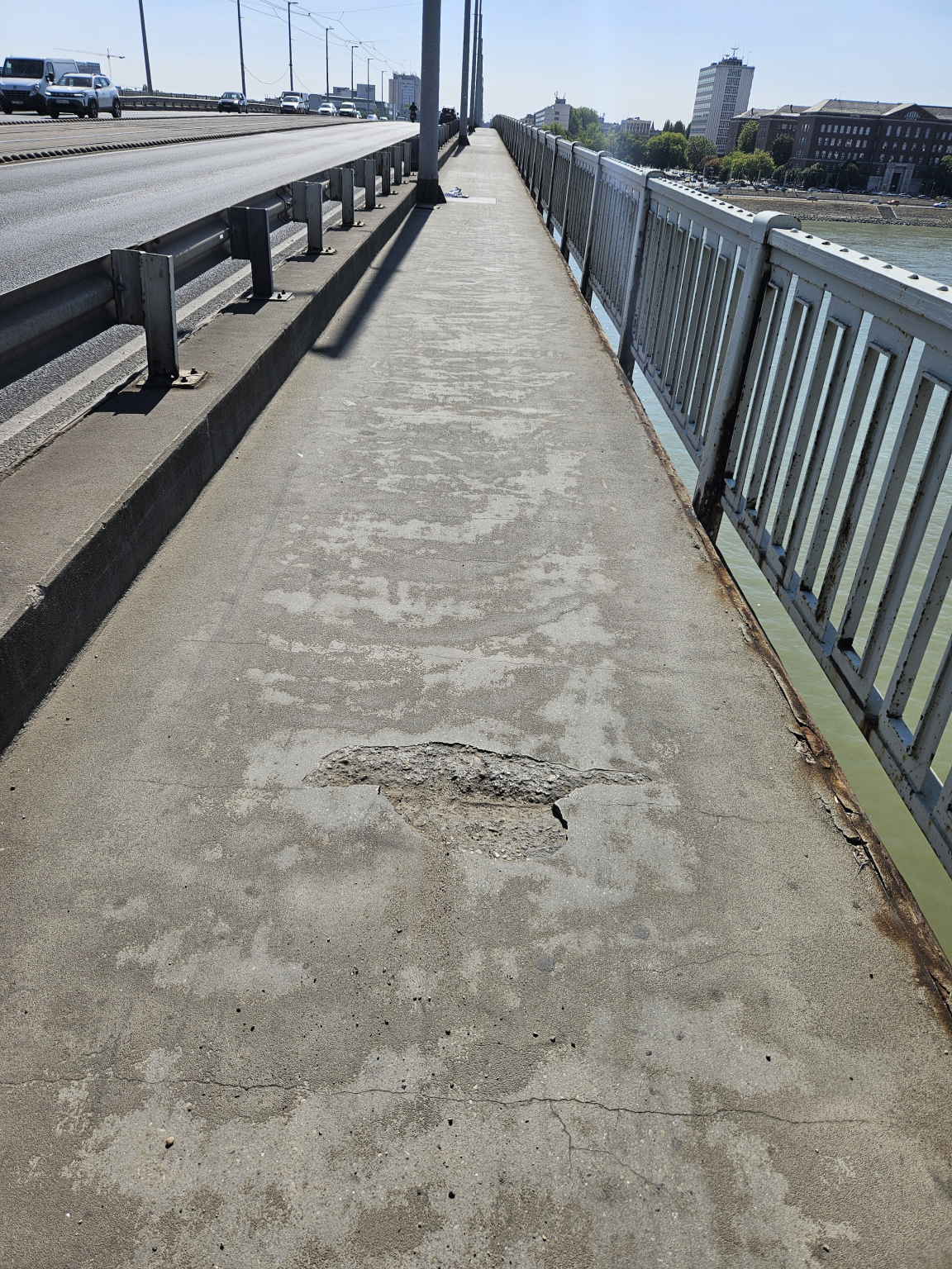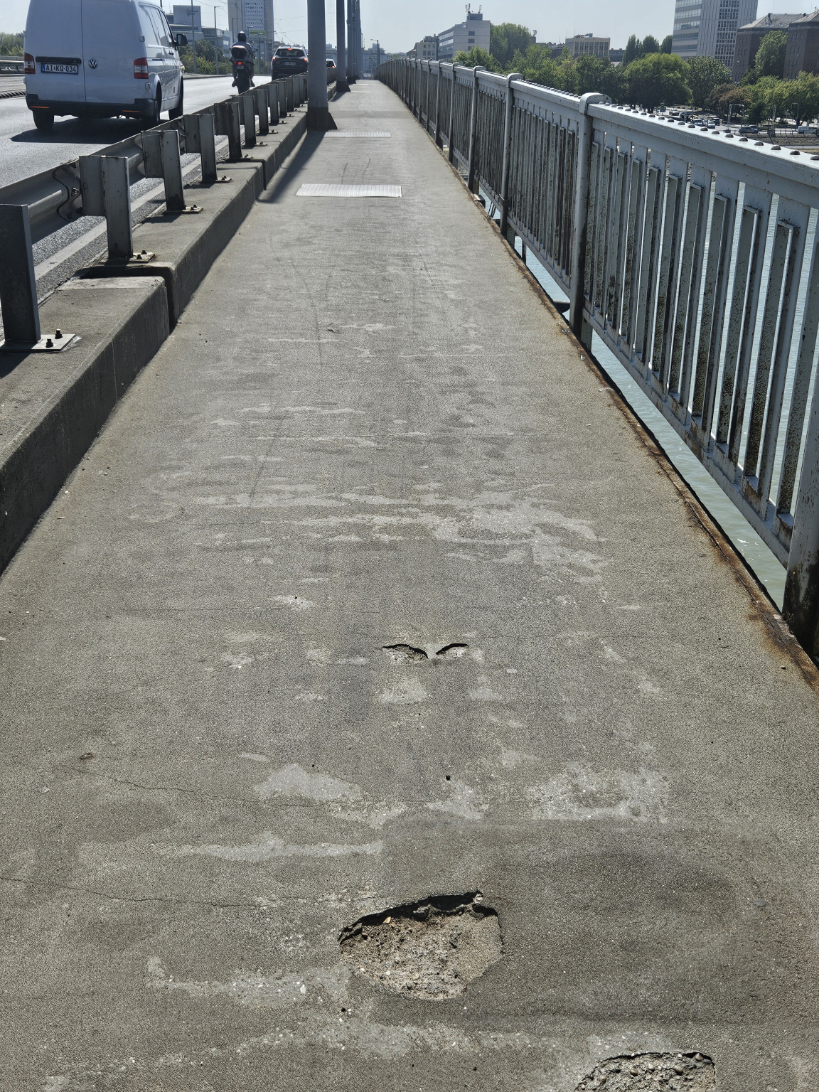 Sok kátyúk van a Petőfi híd északi járdáján.