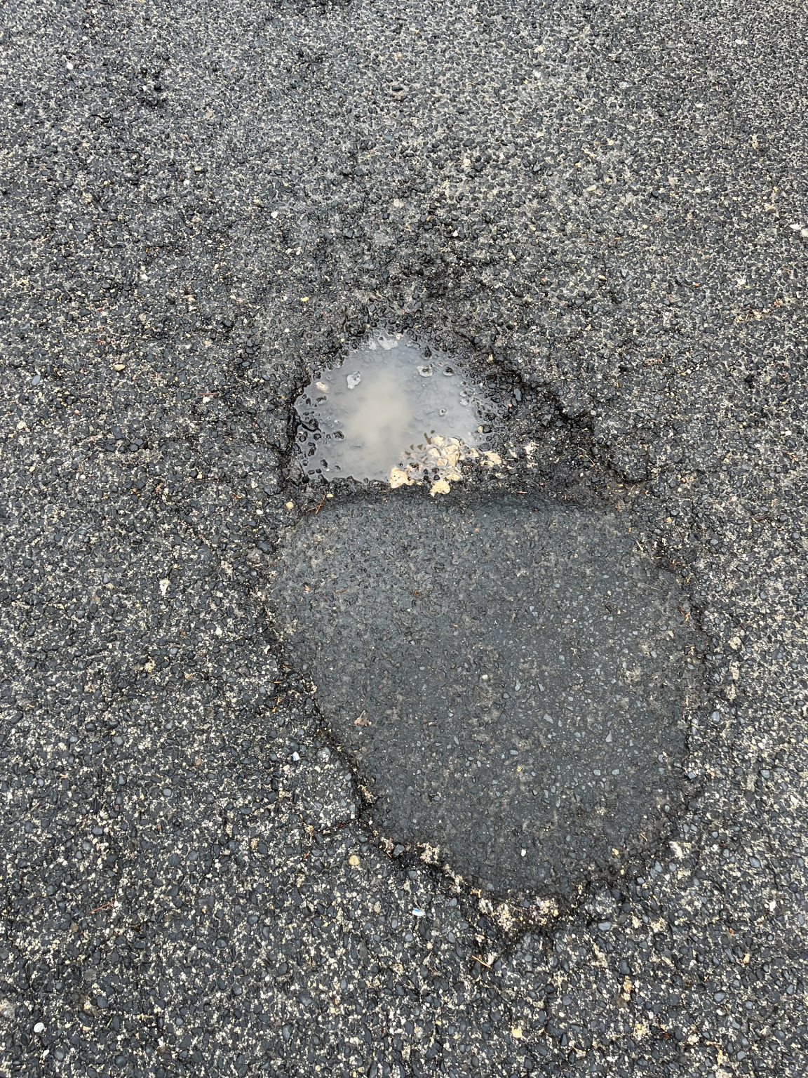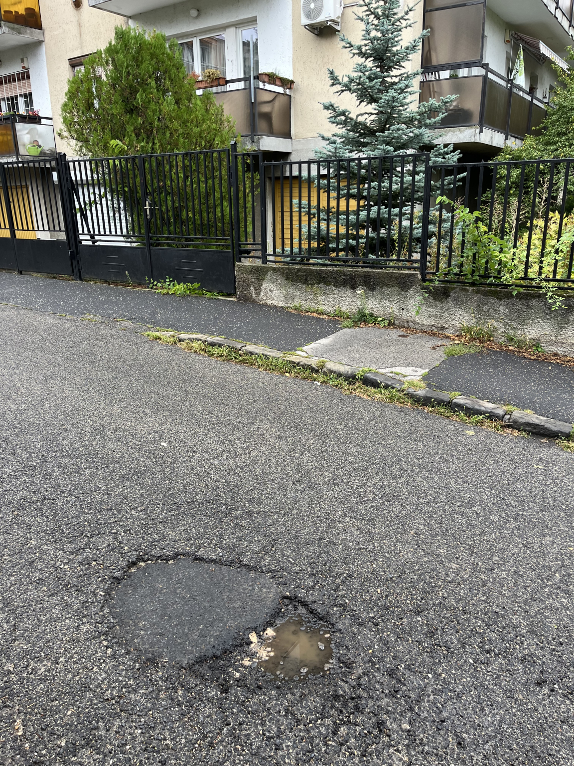 A Mandula utca és Pajzs utca sarkán egy nagy kátyú van
