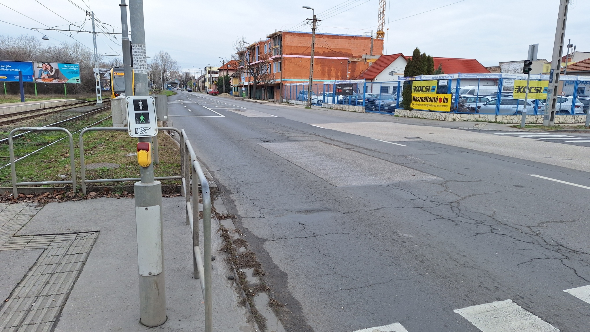 A Határ úton a Mártírok útja / Határ út villamosmegálló melletti részen van egy kátyú.