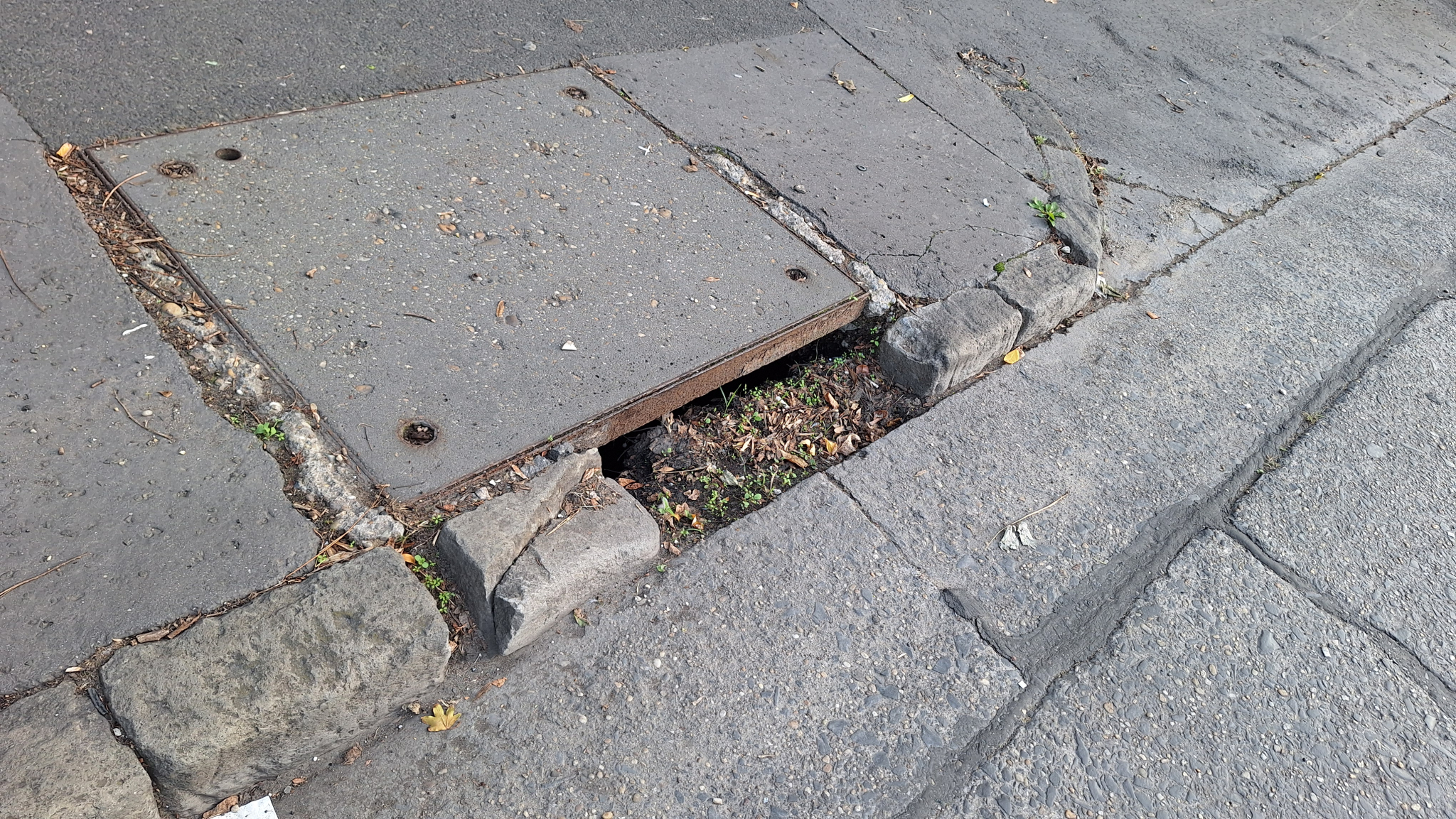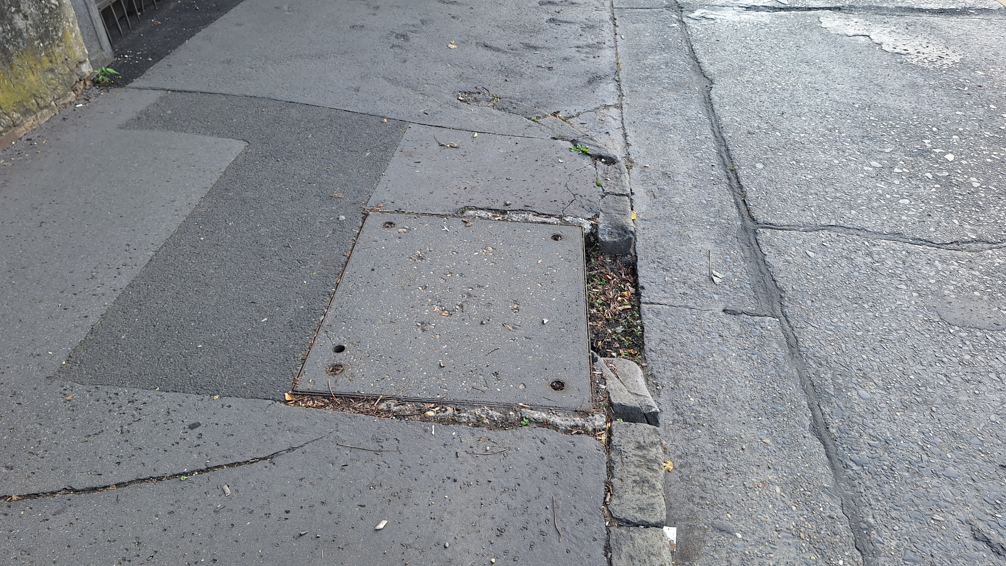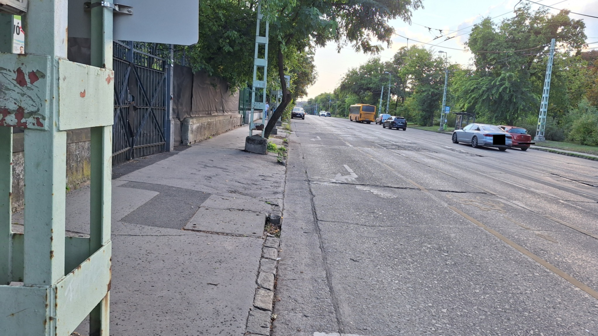 Az Ajtósi Dürer sor és Hermina út sarkánál egy járda szélén lévő aknafedél mellől hiányzik a szegély, így a fedél alatt látható egy rés.