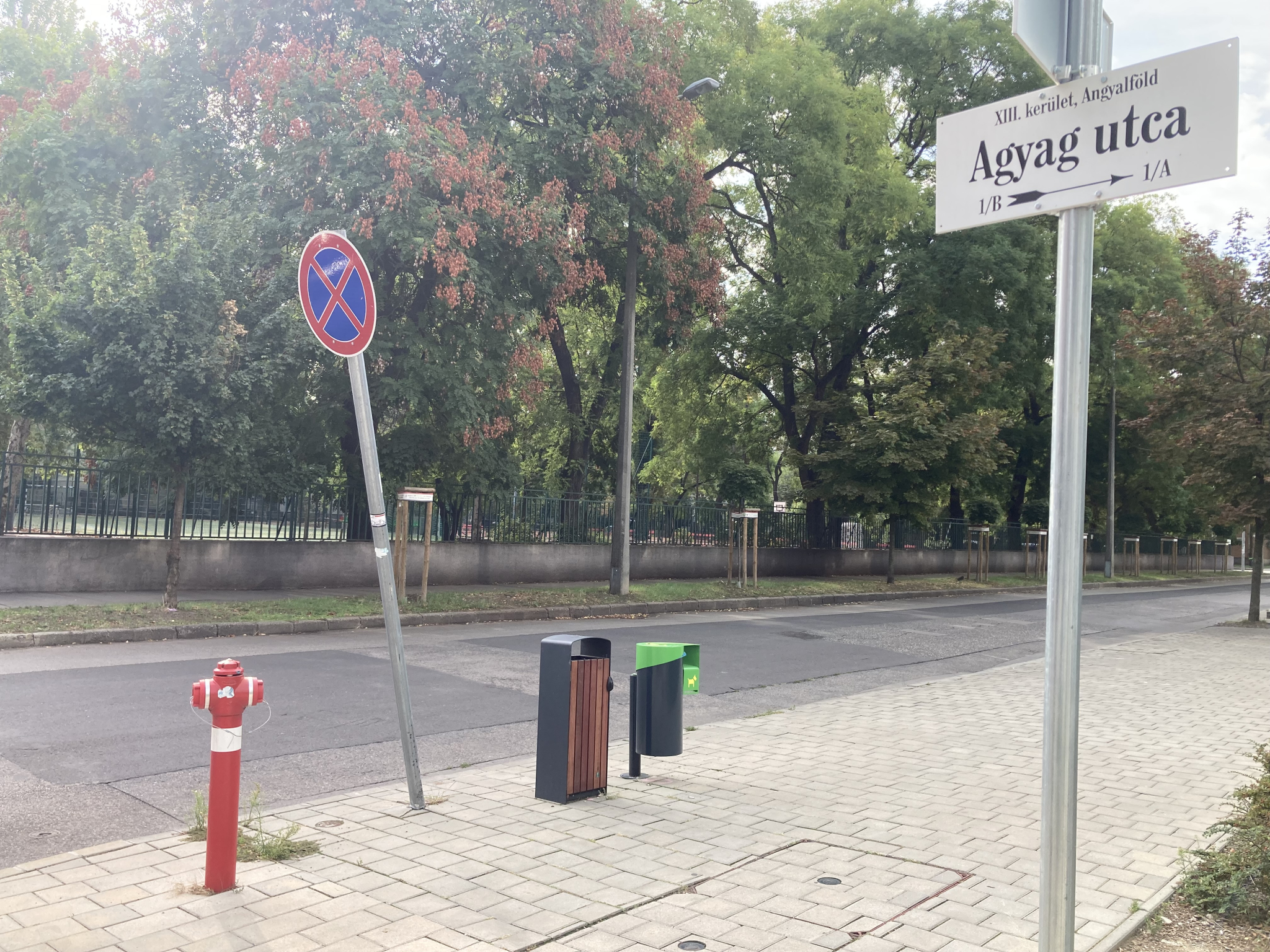 Megállni tilos tábla félig kidőlve a Madarász és Agyag utca sarkán.