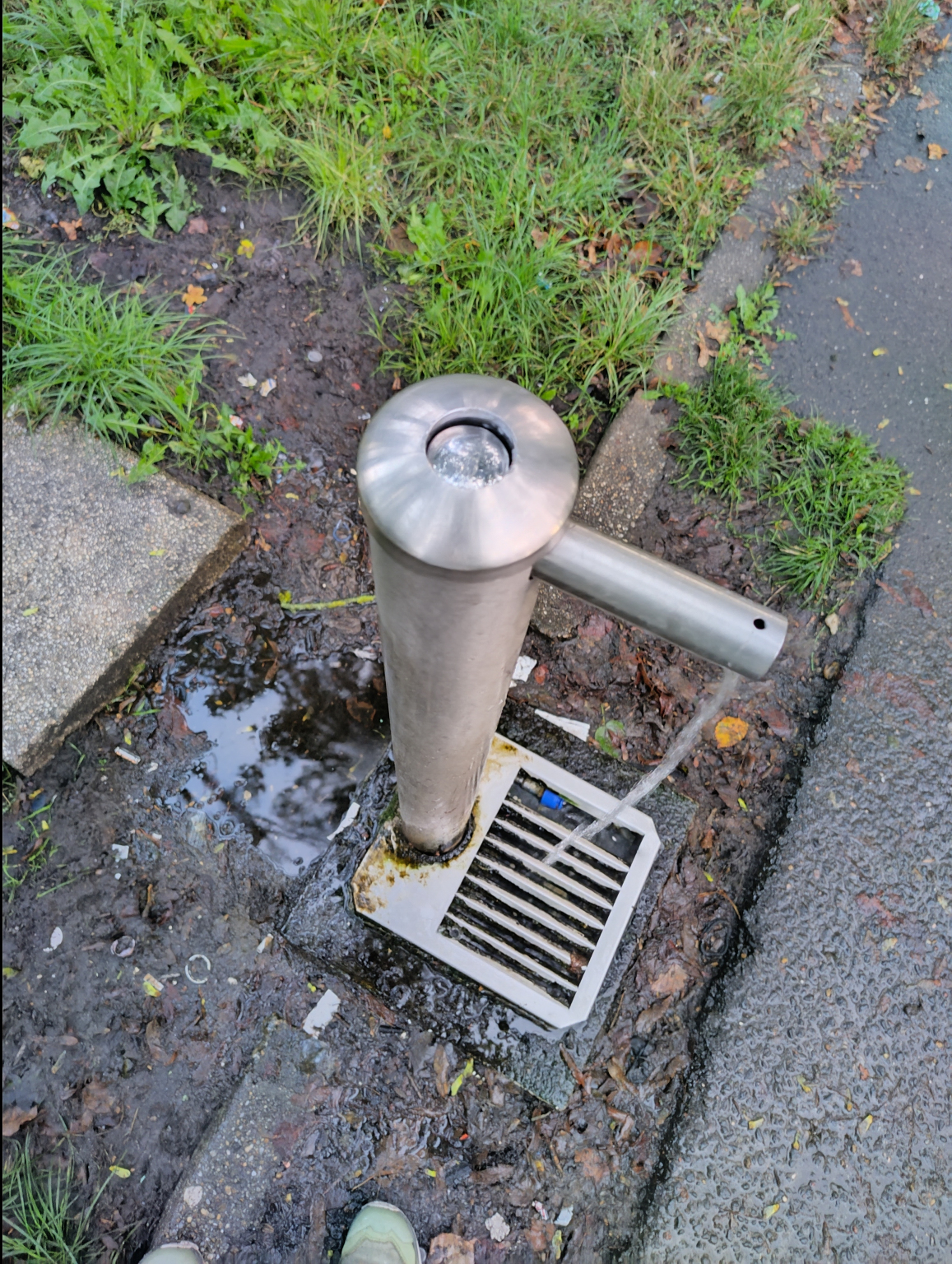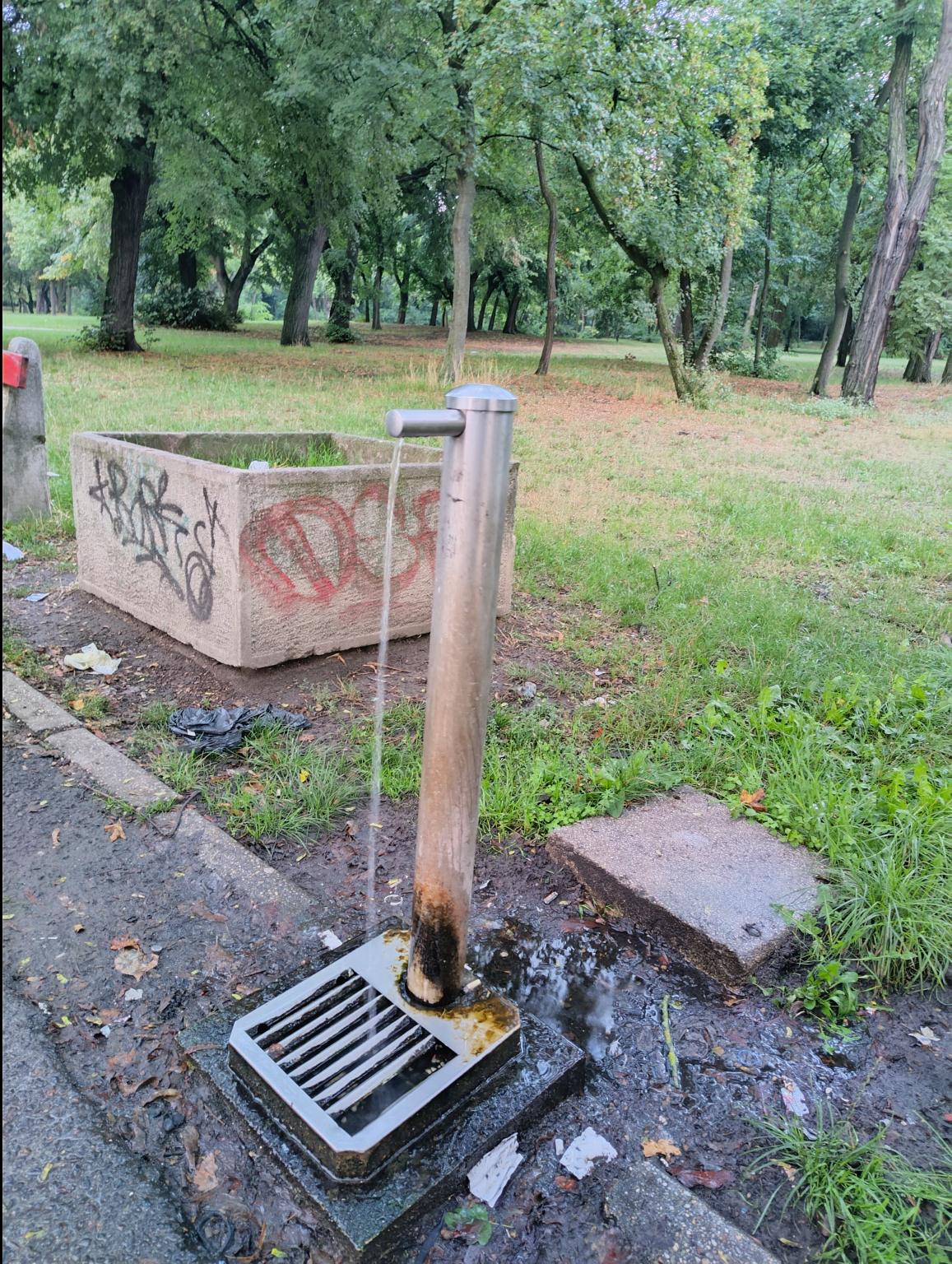 A Népligetben az útburkolat bemutatóval szemben elromlott az ivókút gombja, folyamatosan folyik belőle a víz.