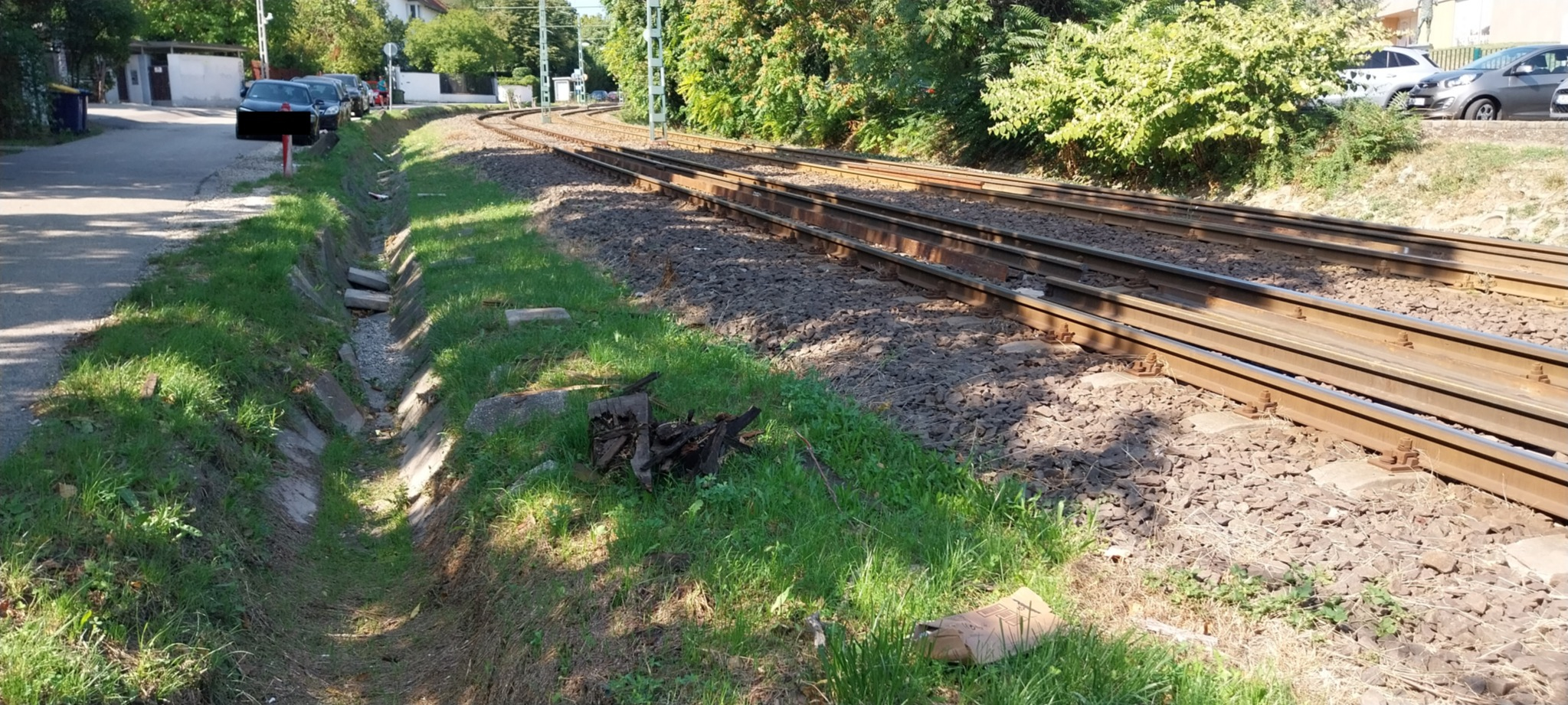 Az augusztusi vágányfelújítás után ott maradtak a lecserélt vagy fel nem használt sínek a villamos sín között.
