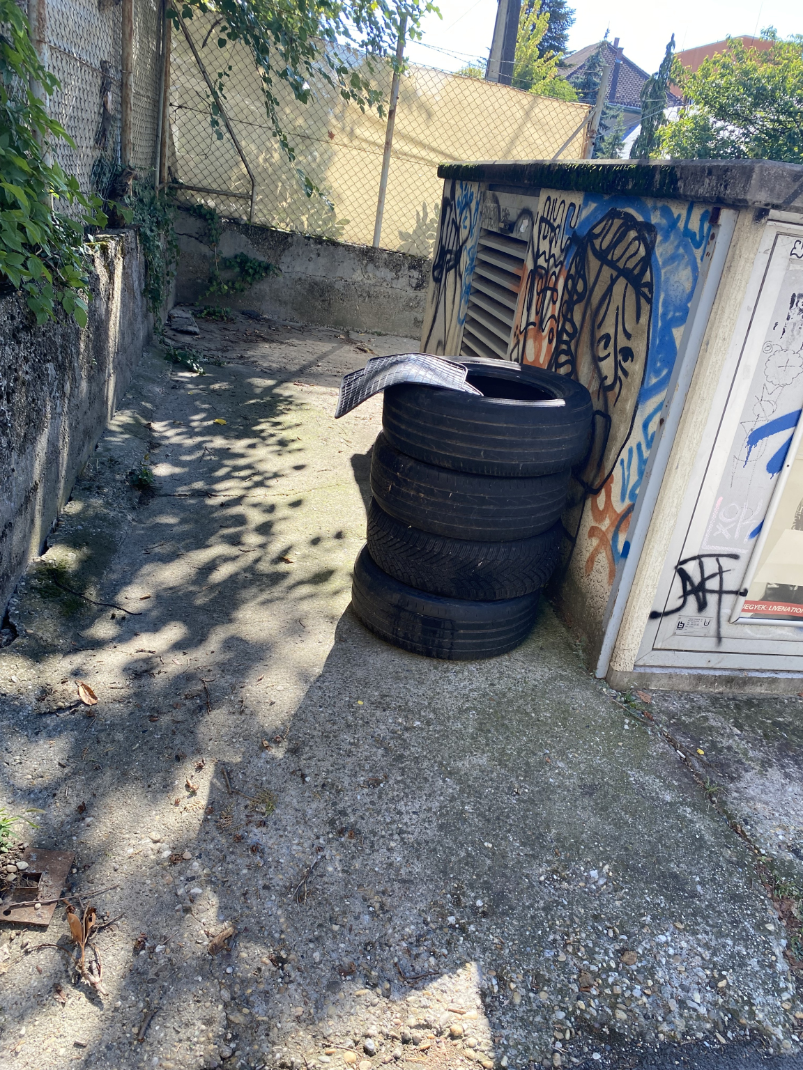 Gumiabroncsok a Bognár utca-Tárogató út sarkán.