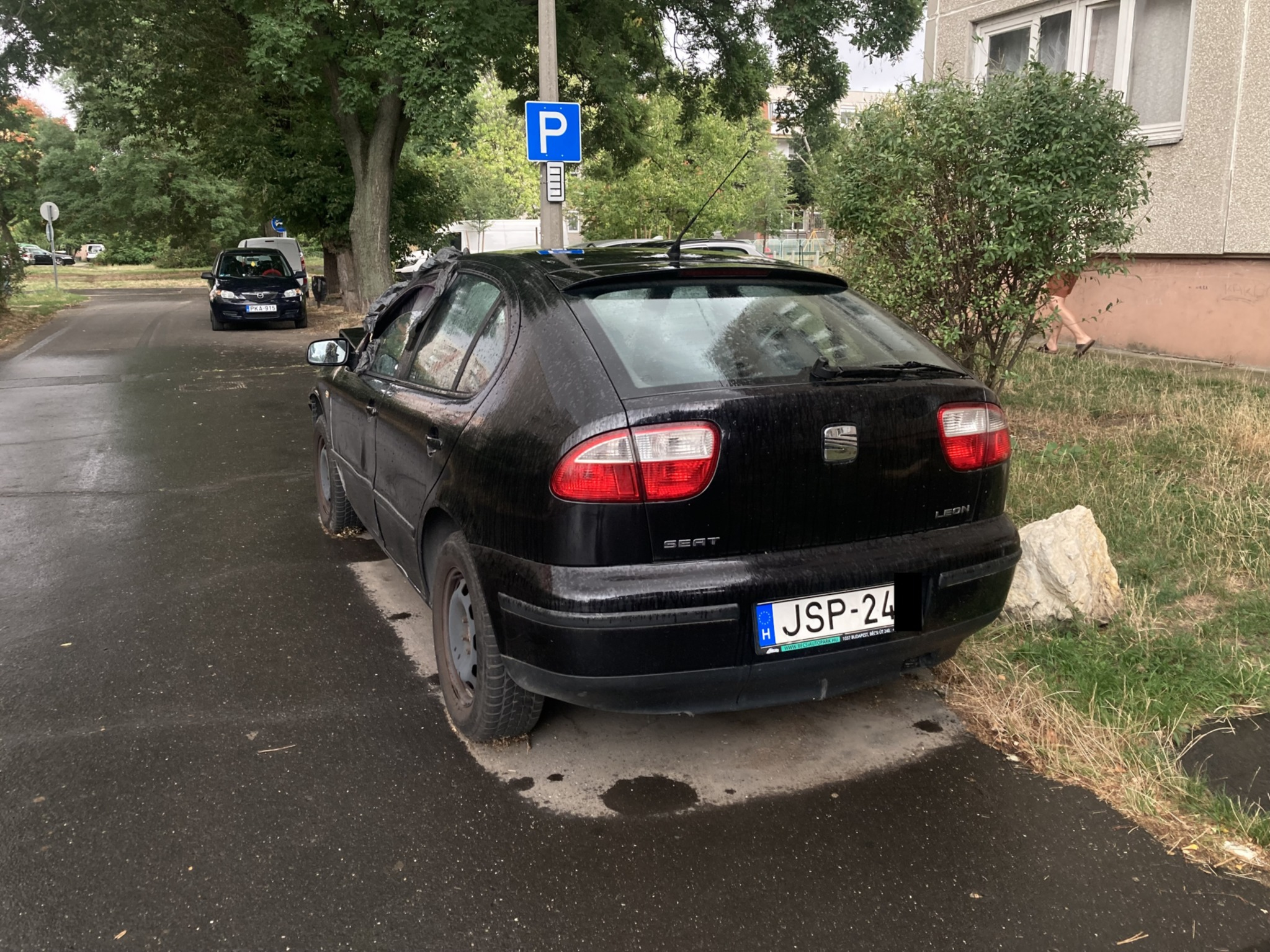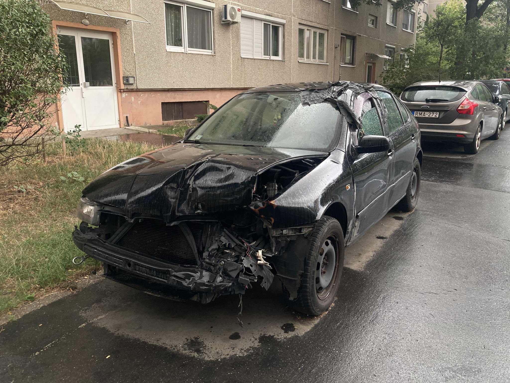 Lakóépületek közt egy roncs autó áll az úton, foglalja a parkolóhelyet.