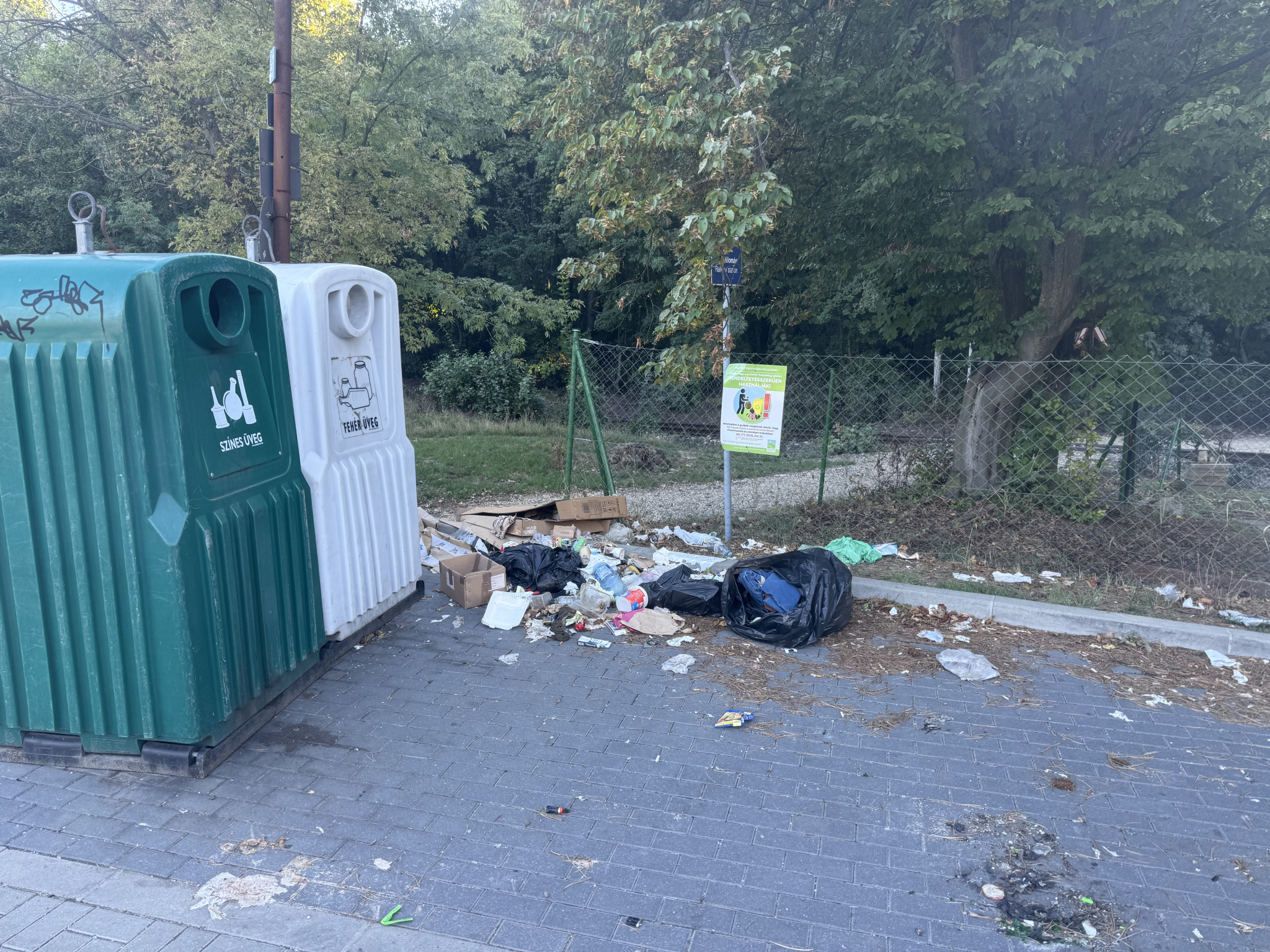 A színes/fehér üveg gyűjtő konténereknél a Normafa gyermekvasút megálló mellett egy nagy szemétkupac található.