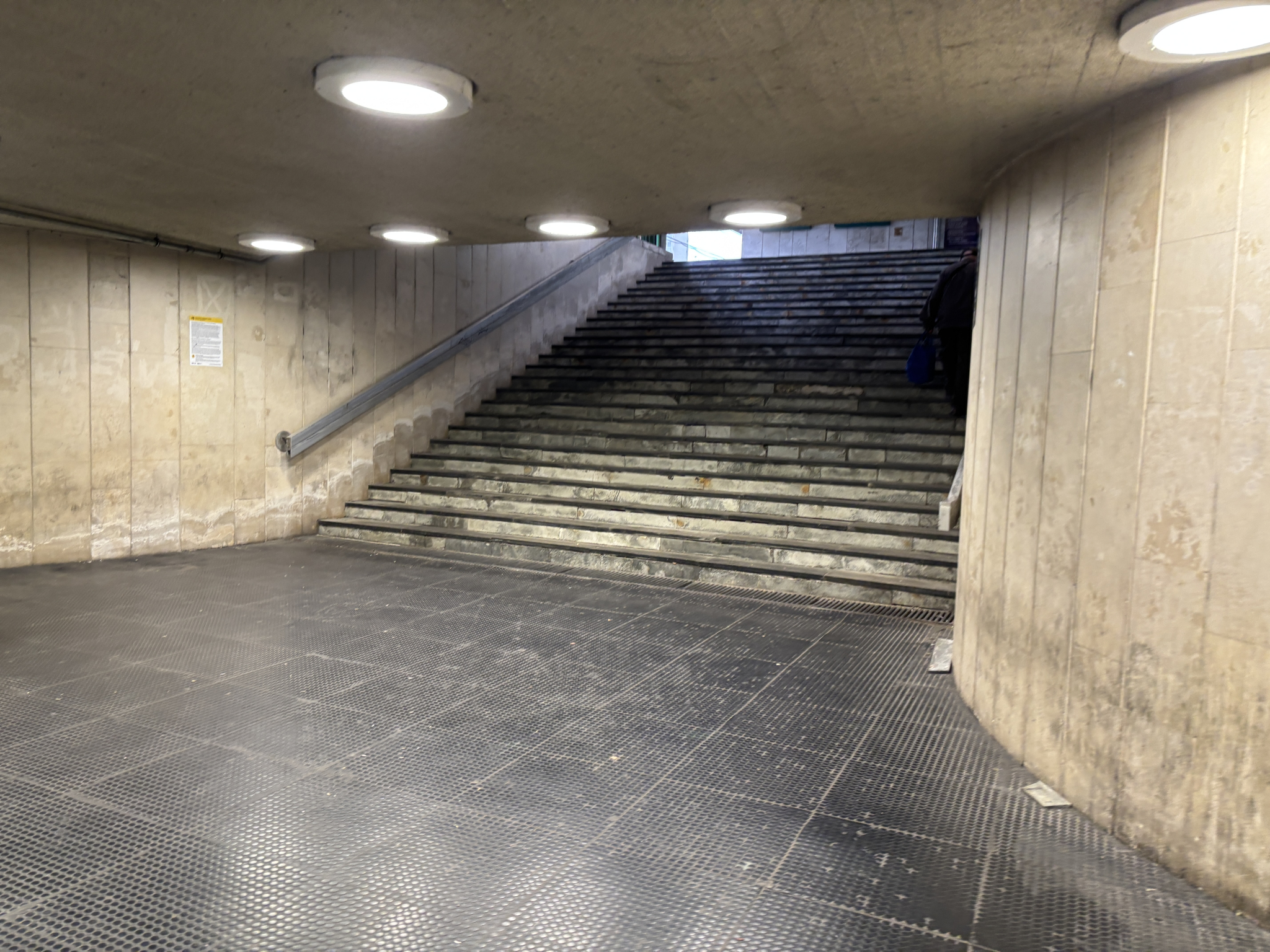 HÉV-ről leszálva semelyik oldalon nincs a lépcső szélén egy babakocsi / bicikli lejáró, ami segítené a lejárást az aluljáróba. Nagyon sok anyukának kell lecipelnie a babakocsit gyerekkel együtt, bicikliseknek a biciklit.