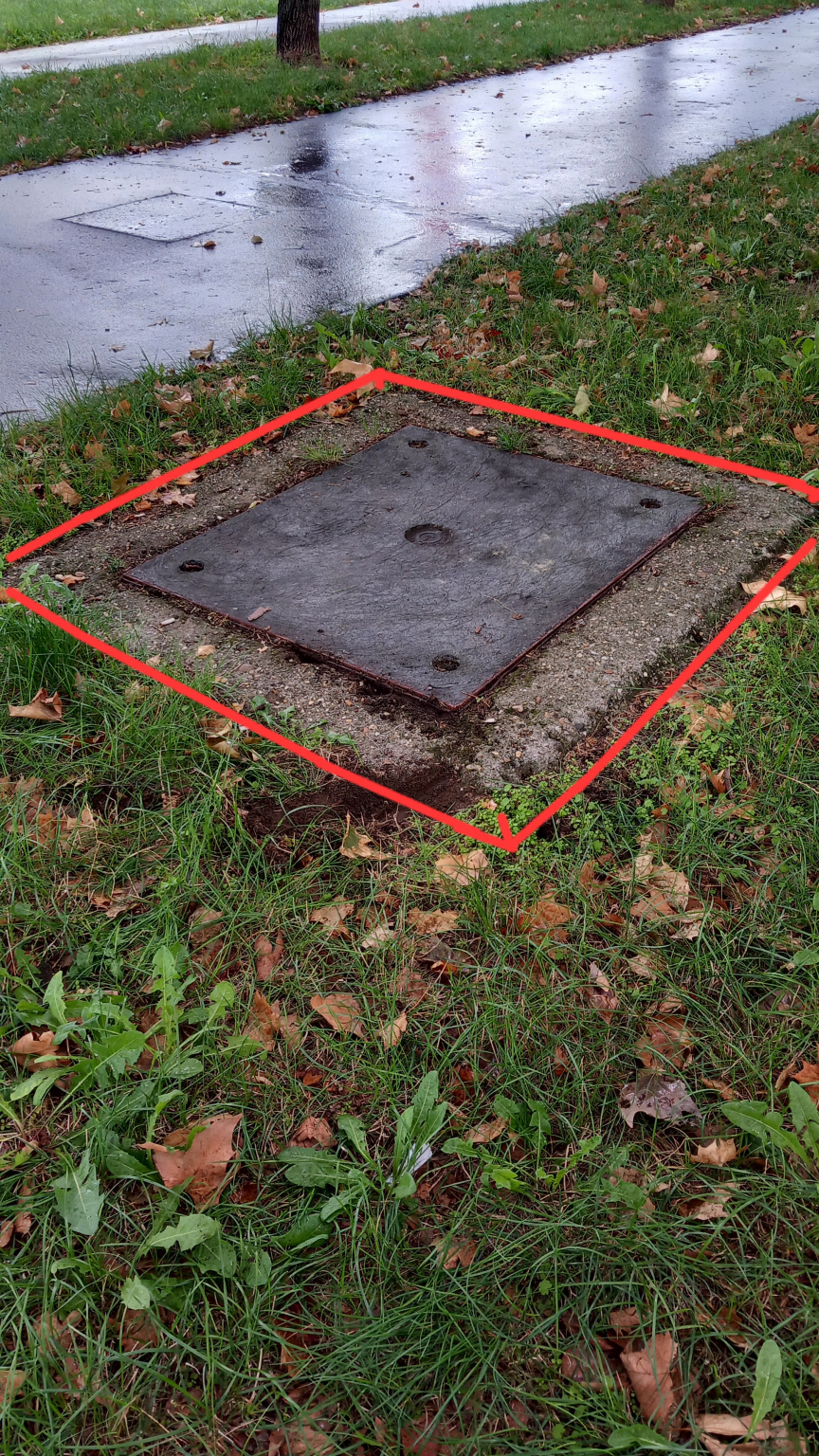 A Gőzmozdony utca 2 társasház mögött a Magyar Telekom fedlap körül szekrénye kilátszanak néhány helyeken a beton darabok a helyükön
