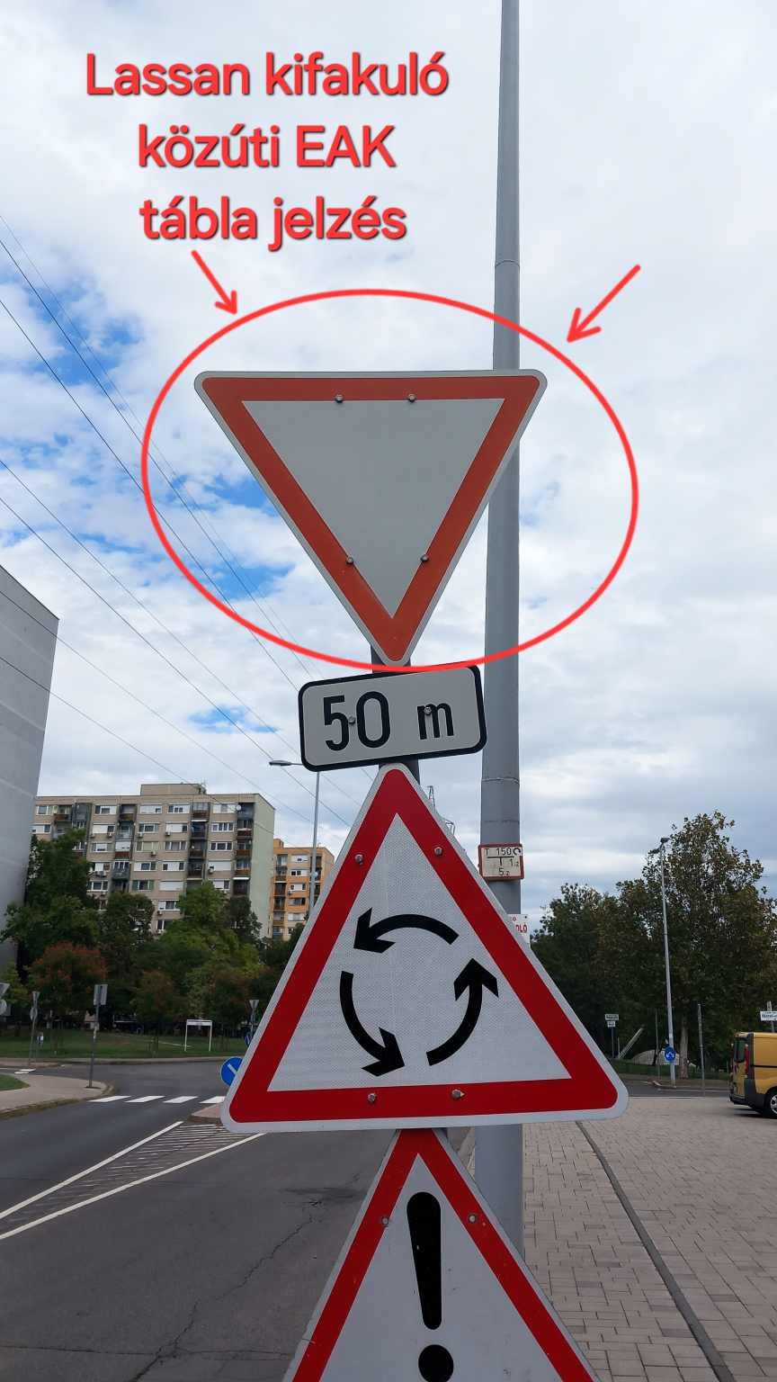 A Tavas utca 3/B mellett közvetlenül elhaladással, körforgalom felé a közúti EAK tábla jelzése lassan kifakulás látható