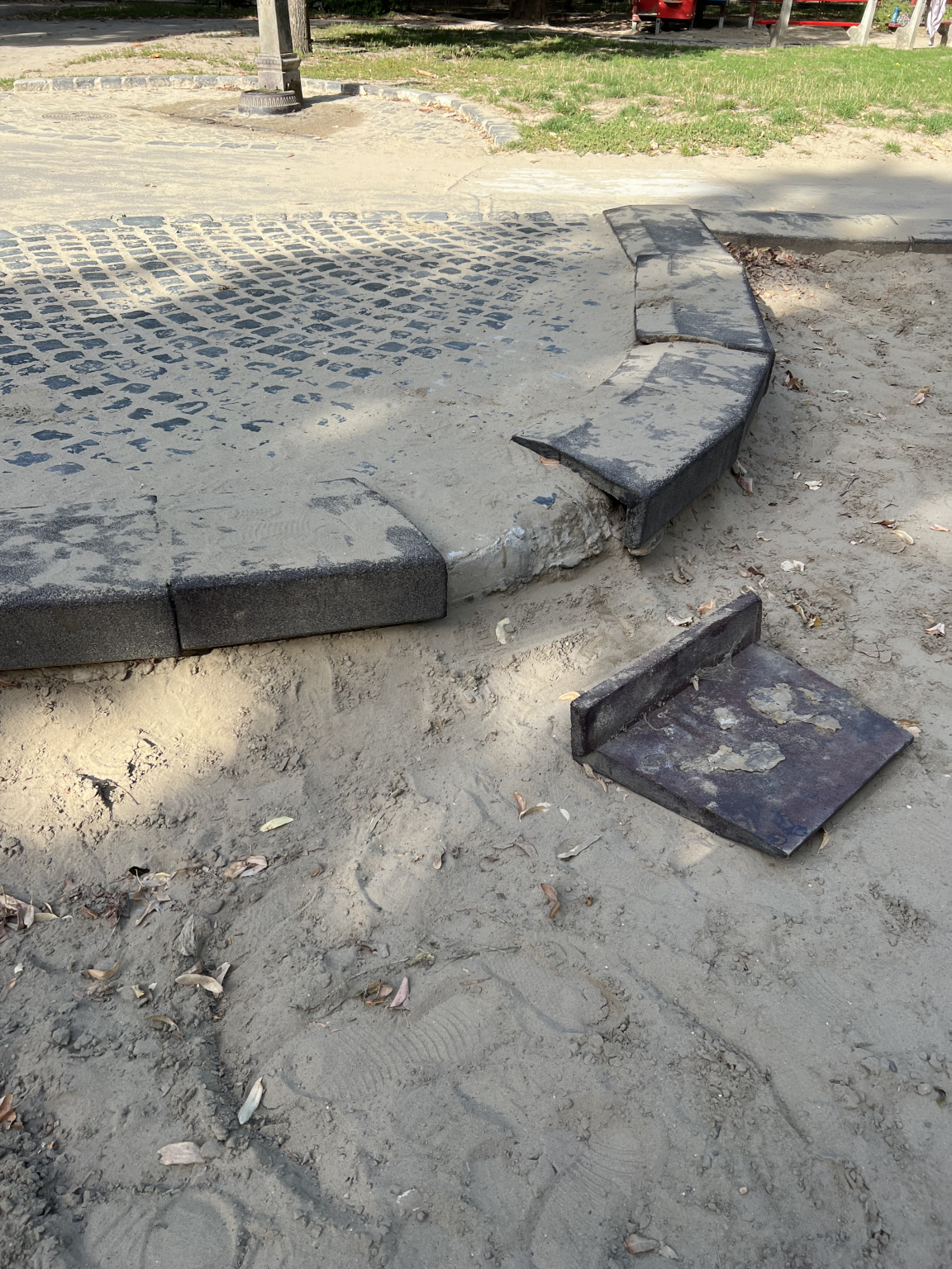 A Városmajori játszótéren balesetveszélyes a homokozó széle,az egyik elem leesik.