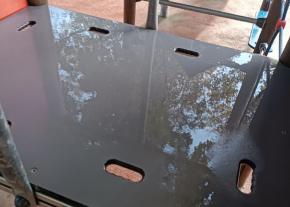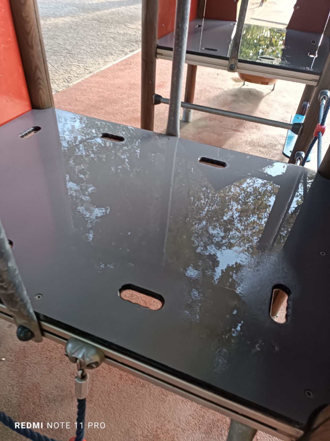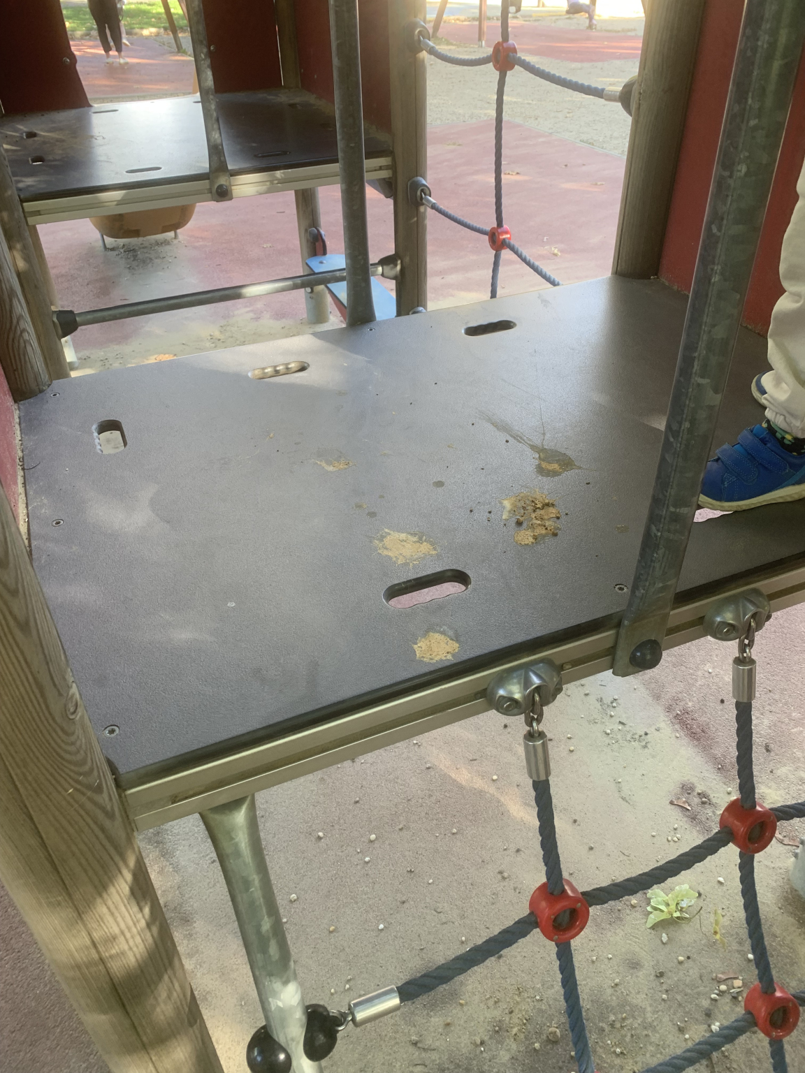 Egy emberi vagy állato széklet van elkenve a játék azon felületén, ahol a gyerekek négykézláb másznának. Áfonya utcai oldal, csúszdás mászókának a nyugati felén.