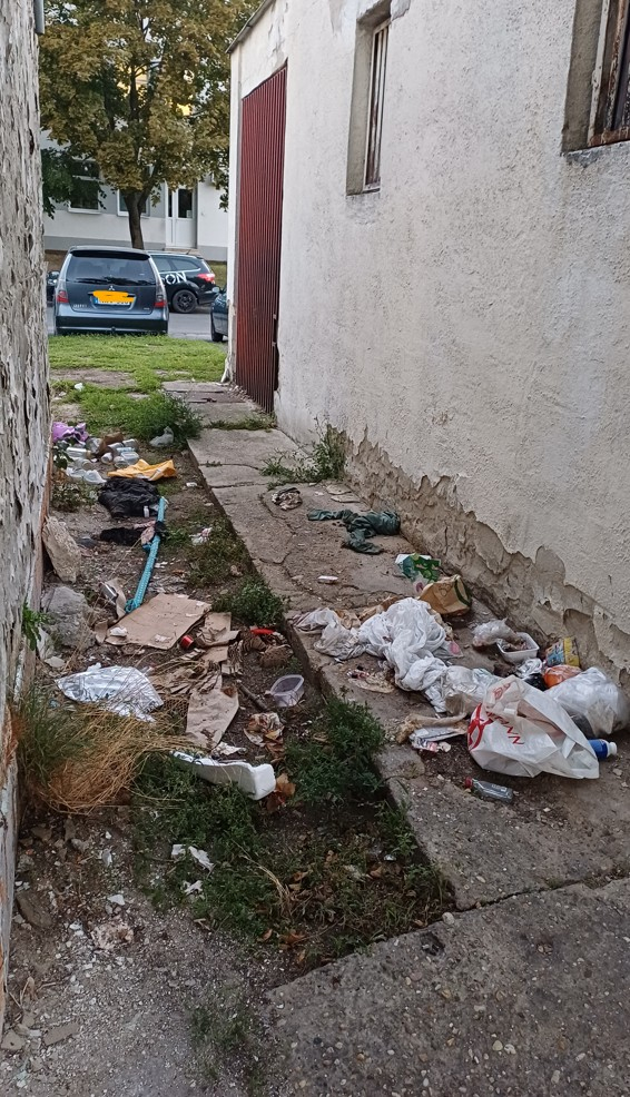 Az SZTK melletti üzletsor épületei között hulladék van.