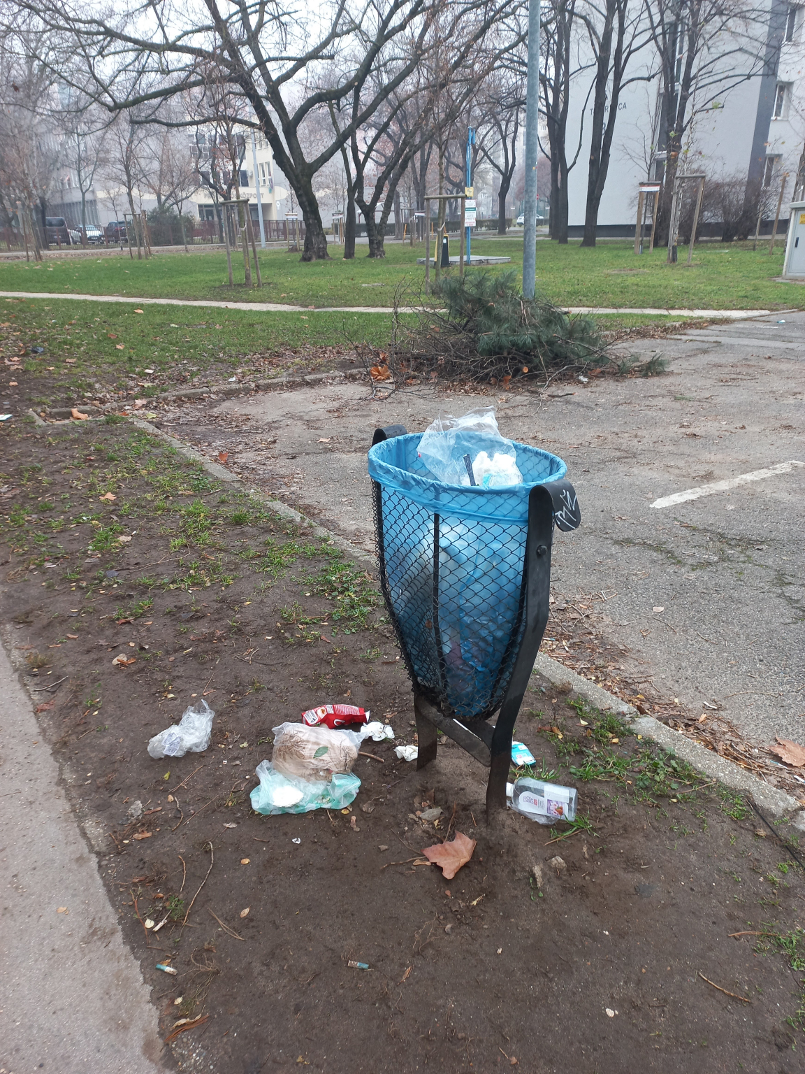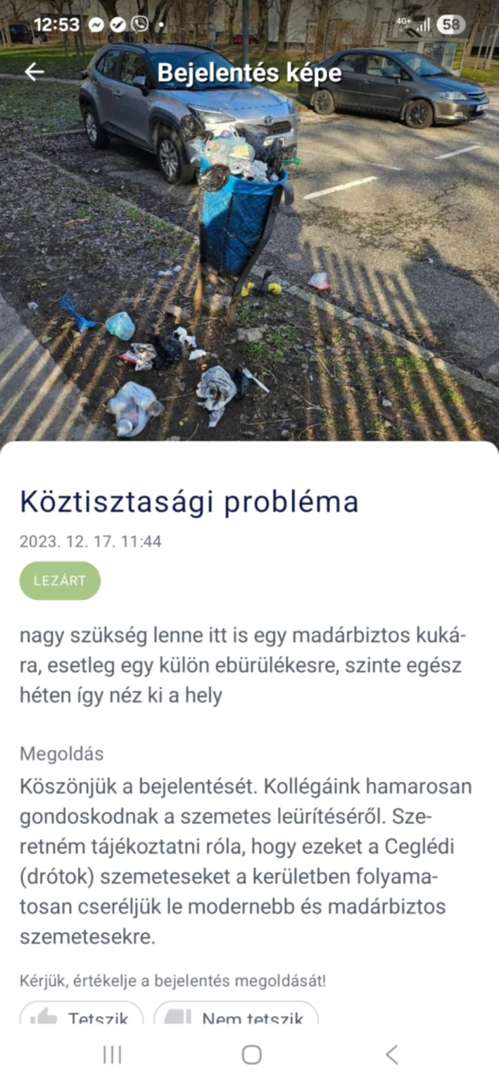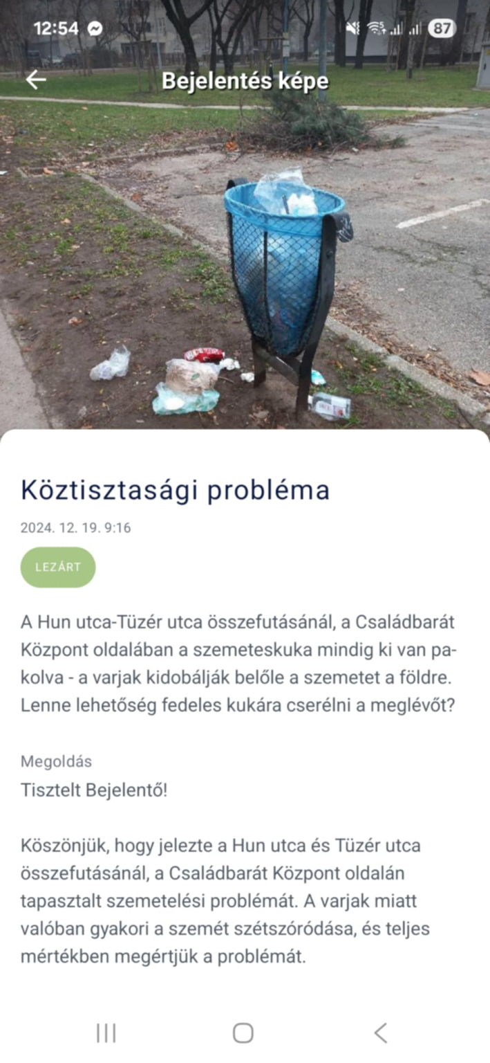 Először 2023 decemberében jeleztük a problémát a XIII. kerületi önkormányzat felé, miszerint a Hun utca-Tüzér utca összefutásánál, a Családbarát központ oldalában az autós beálló mellett a kukát nagyon sokan háztartási szemét lerakásához használják. Emellett mivel nyitott, ezt a varjak folyamatosan kipakolják, tehát a teljes füves terület be van borítva szeméttel, ami nem csak nagyon rossz látvány, de köztisztasági veszélyforrás is (gyerekek, kutyák rendszeresen közlekednek a területen). Az önkormányzat 2023-ban azt ígérte, hogy hamarosan sor kerül a cserére, folyamatosan cserélik a környéken a kukákat. Ezután 1 évig nem történt semmi, 2024 decemberében újra bejelentettük a problémát, szintén semmi reakció, csak az ígéretek. Lassan 2 éve lesz, hogy nem történik semmilyen előrelépés az ügyben, pedig nem egy bonyolult műveletről van szó. Csatolom képként a 2023-as és 2024-es bejelentéseket is.