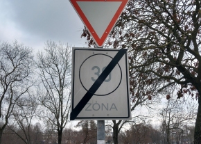 A Pára utca 8 as szám alatt parkoló kijáratánál a 30 as zóna fölött található pirossal jelölve az EAK tábla teljesen mértékben megrongálódott